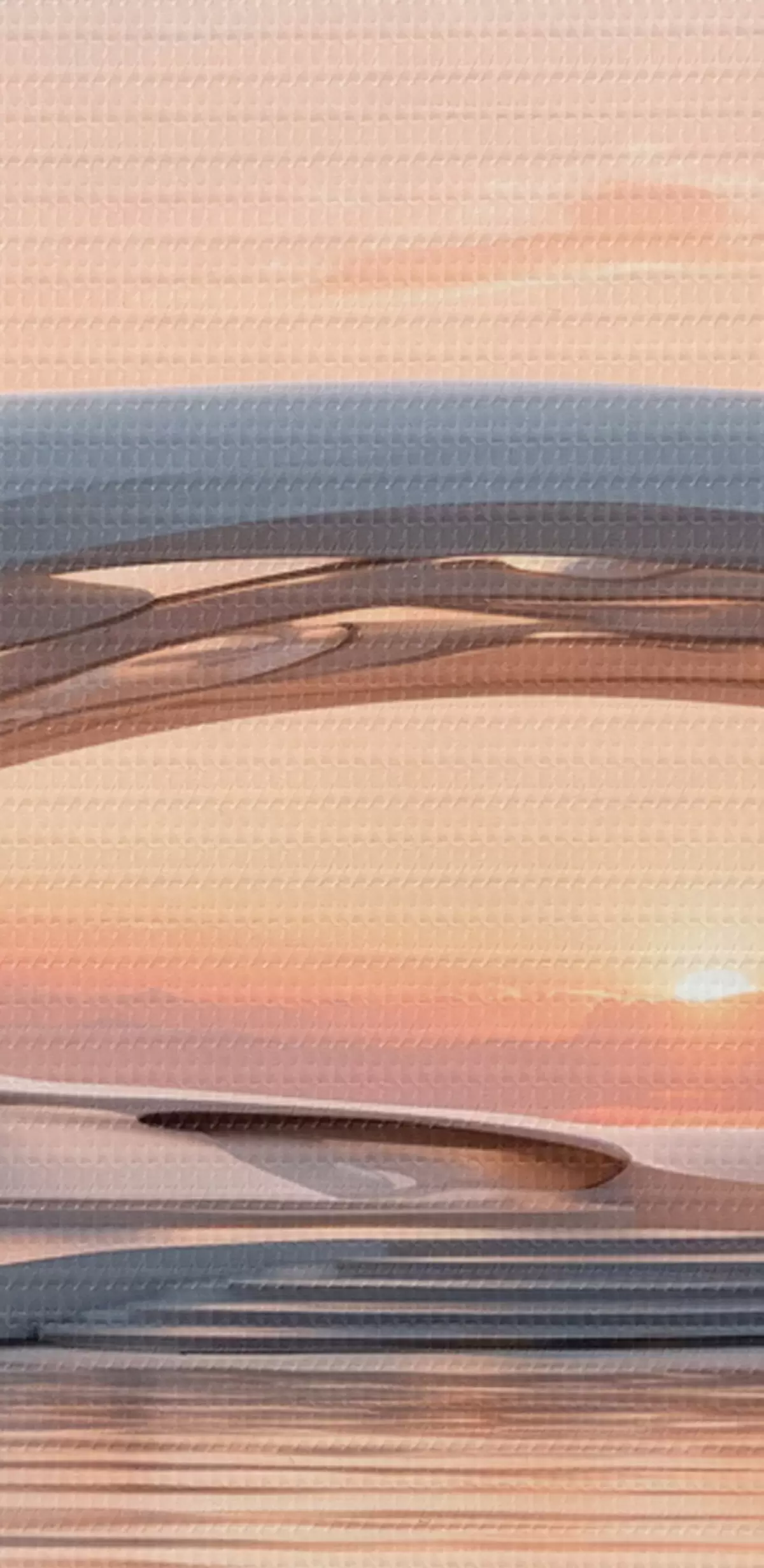carta da parati Edificio futuristico sull'acqua contro un tramonto rosa nr. s44884