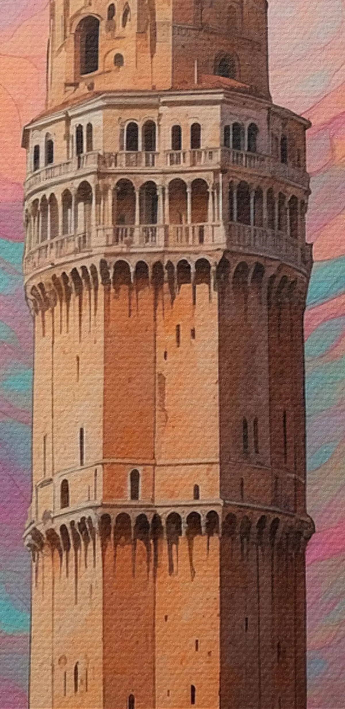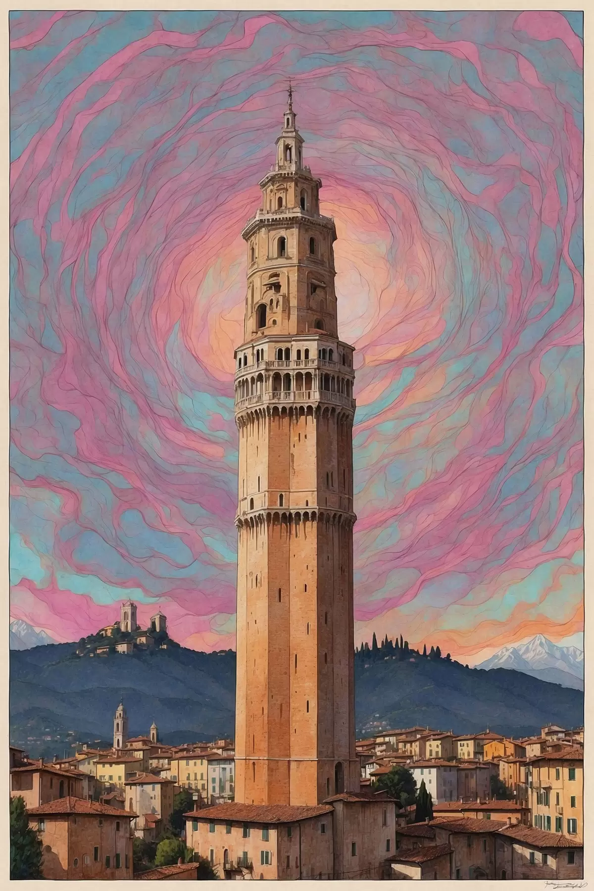 Quadri Torre di fantasia contro il cielo con spirali rosa e blu Nr s44885
