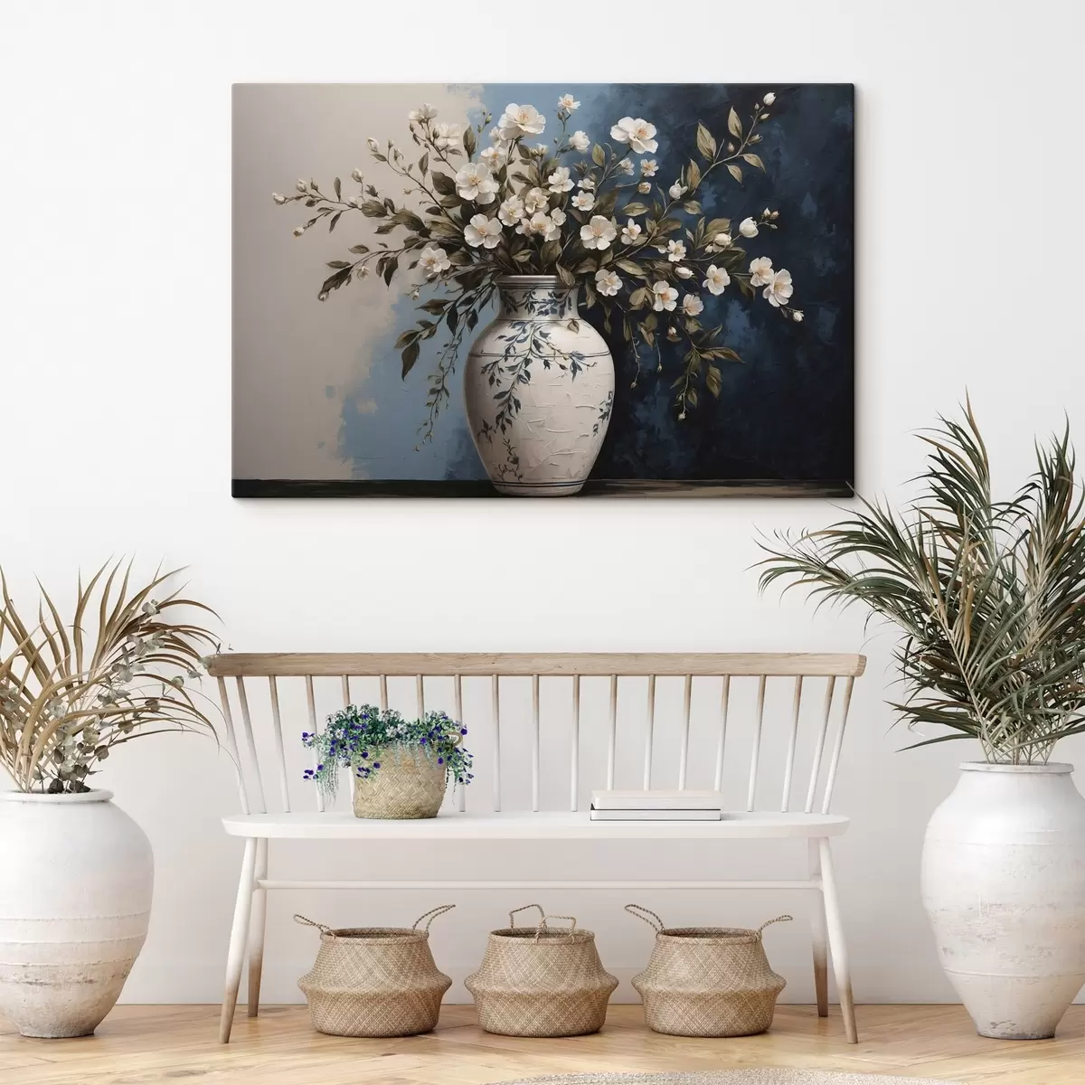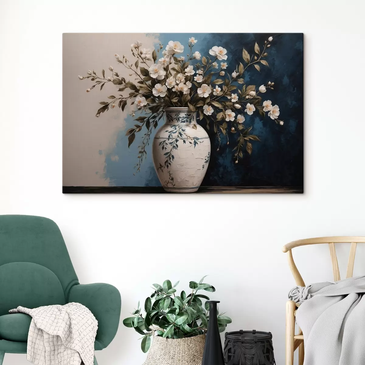 Quadri Fiori bianchi e gialli in un grande vaso su sfondo blu Nr s44893