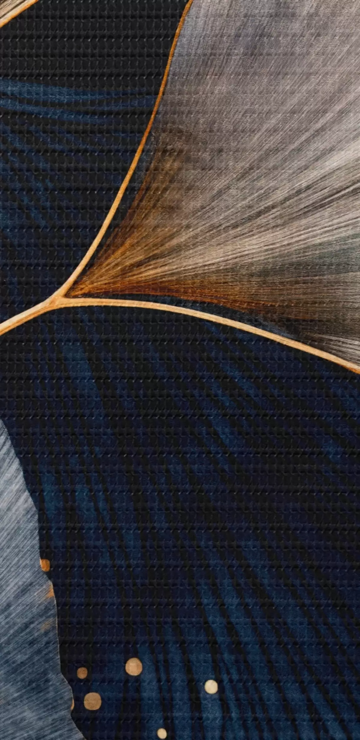 Quadri Foglie di ginkgo nei toni del giallo e del blu, elegante sfondo scuro, arte moderna, stile minimalista, ispirato alla natura Nr s44921