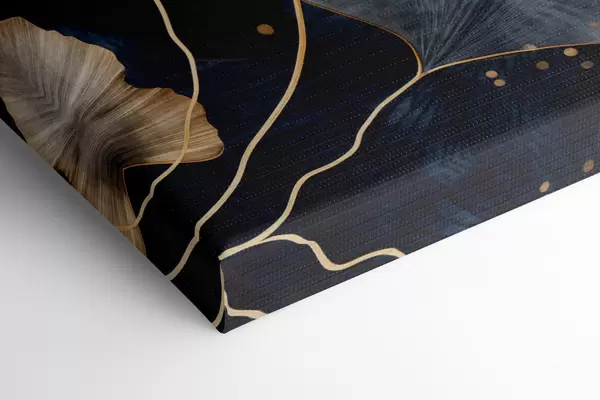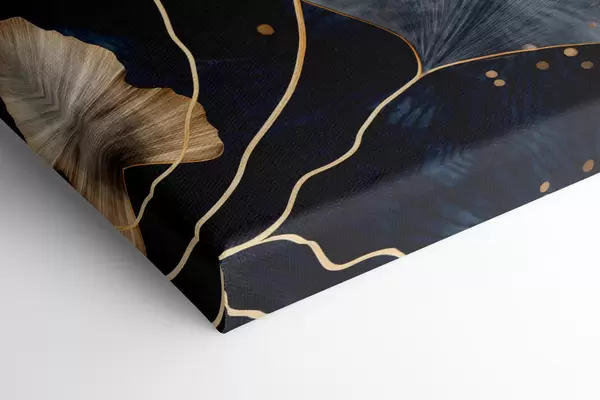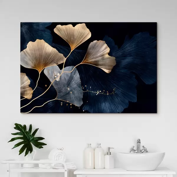 Quadri Foglie di ginkgo nei toni del giallo e del blu, elegante sfondo scuro, arte moderna, stile minimalista, ispirato alla natura Nr s44921