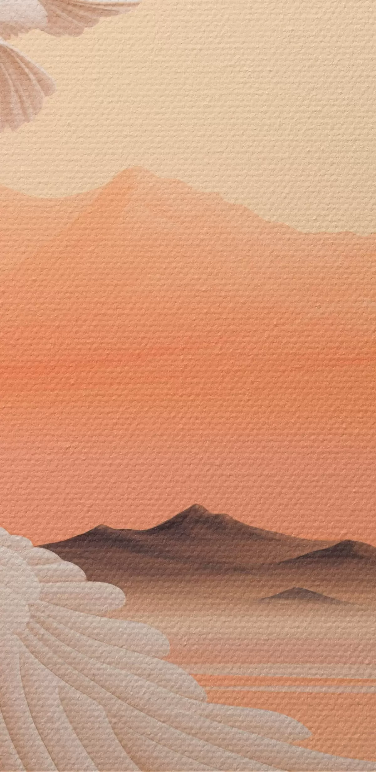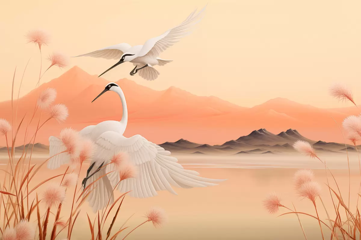 carta da parati Gru bianche con canne rosa in primo piano, montagne e lago sullo sfondo, luce arancione soffusa nr. s44925