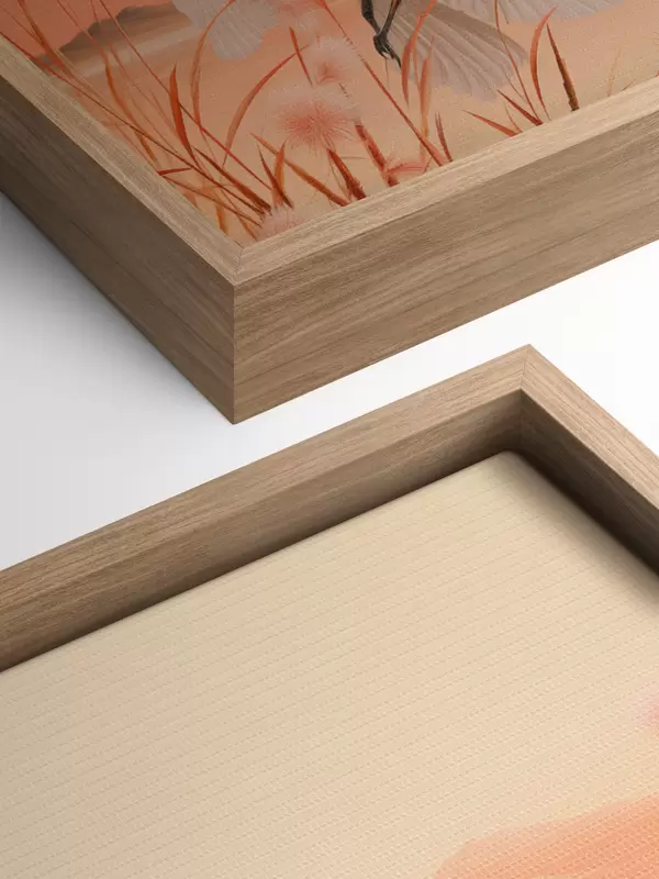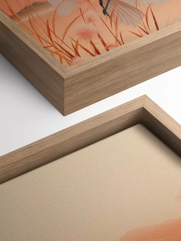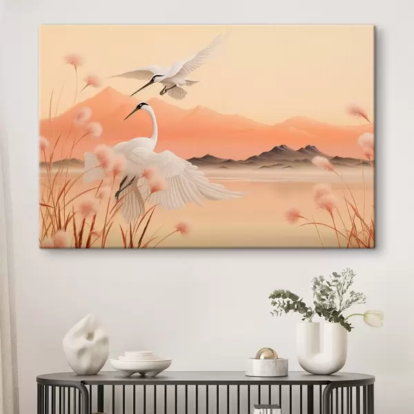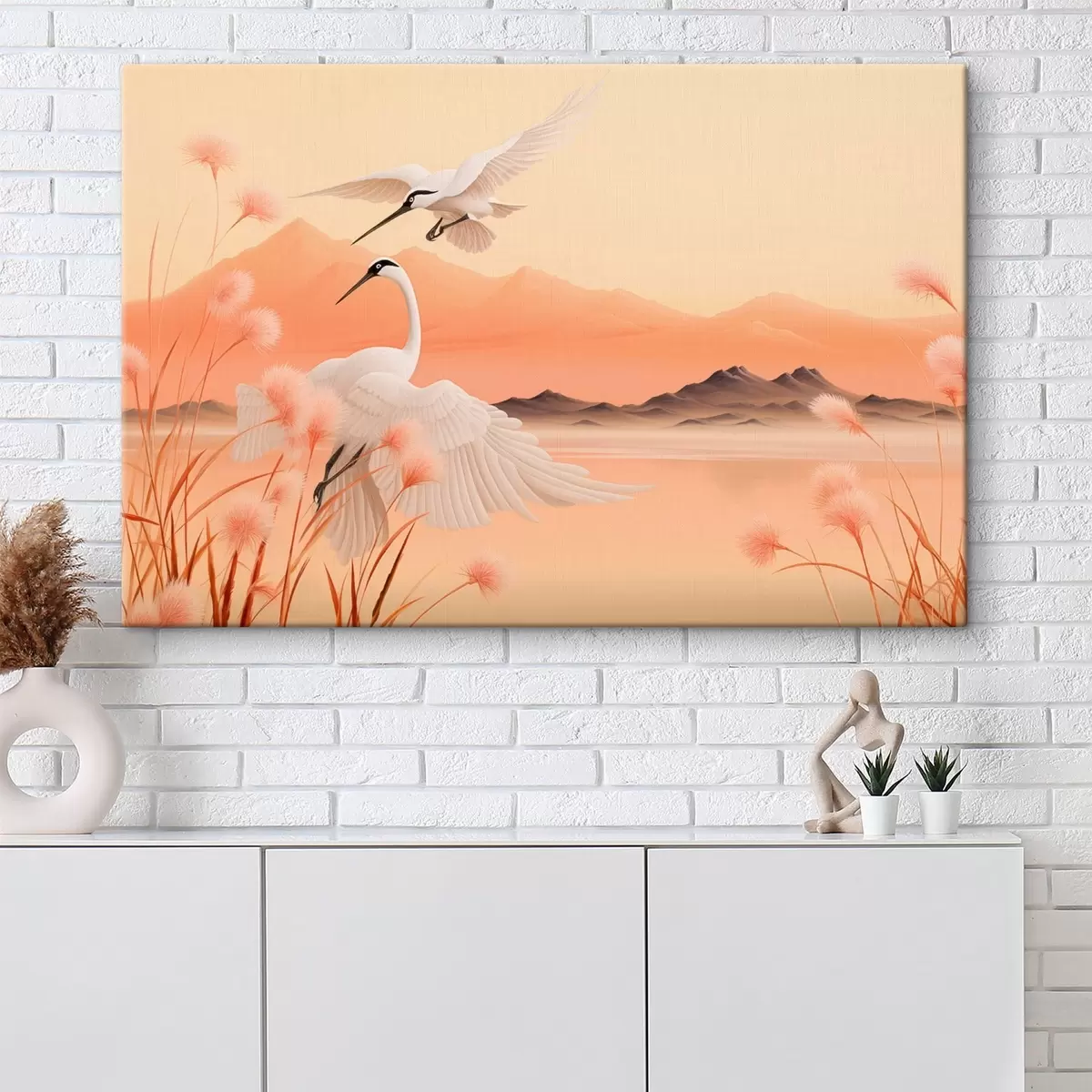 Quadri Gru bianche con canne rosa in primo piano, montagne e lago sullo sfondo, luce arancione soffusa Nr s44925