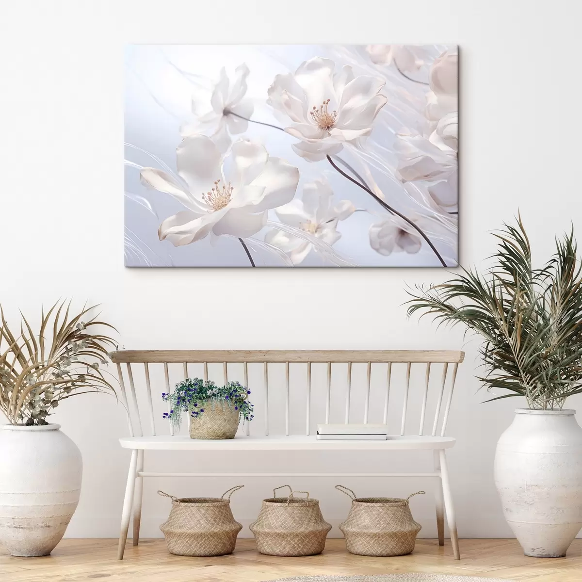 Quadri Fiori bianchi con petali traslucidi, sfondo azzurro tenue, elegante, romantico, delicato, sognante Nr s44931