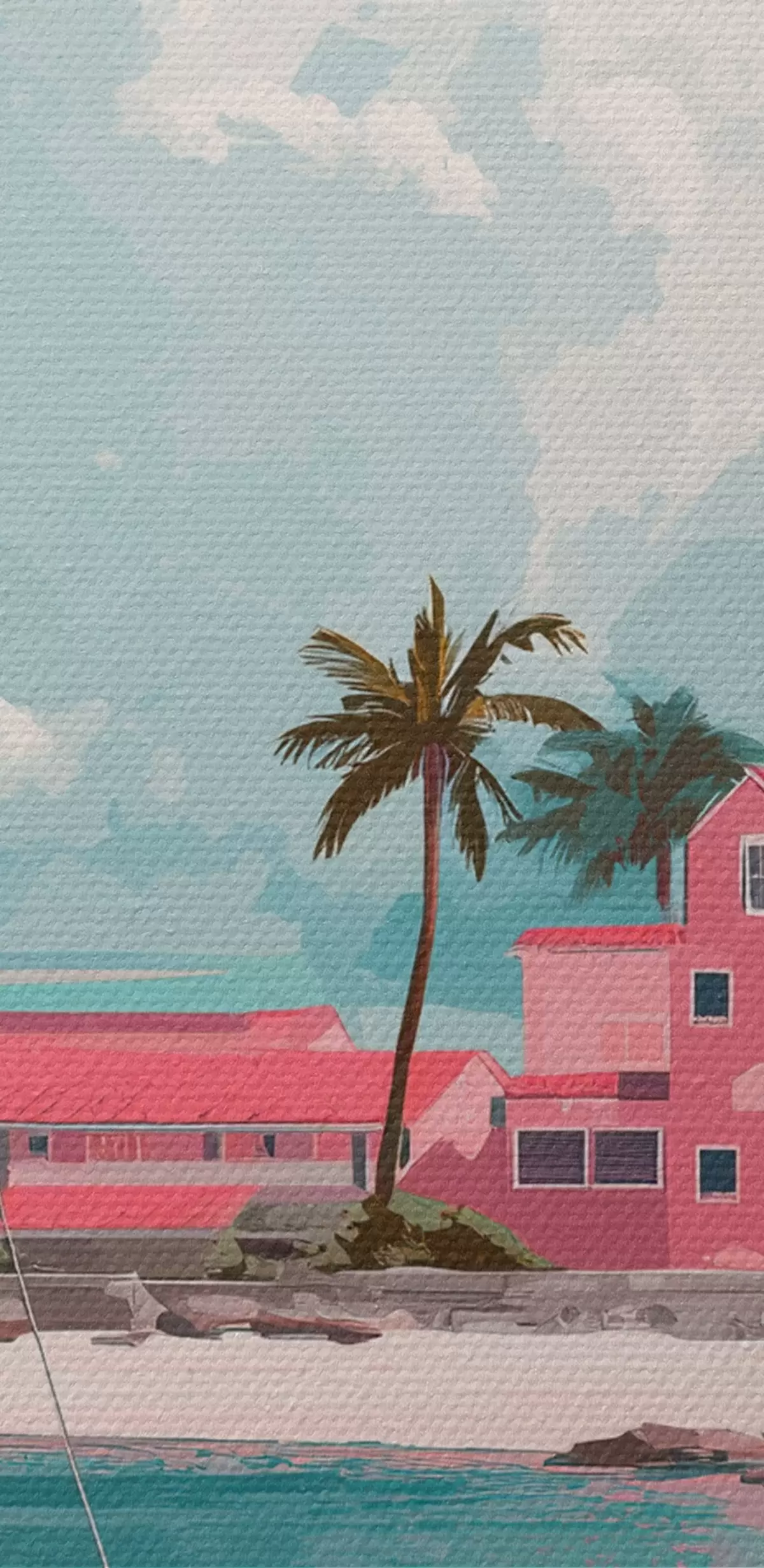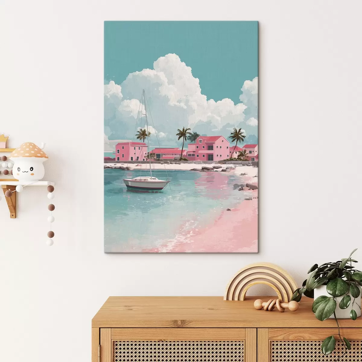 Quadri Spiaggia rosa con sole splendente, barca a vela e case Nr s44986