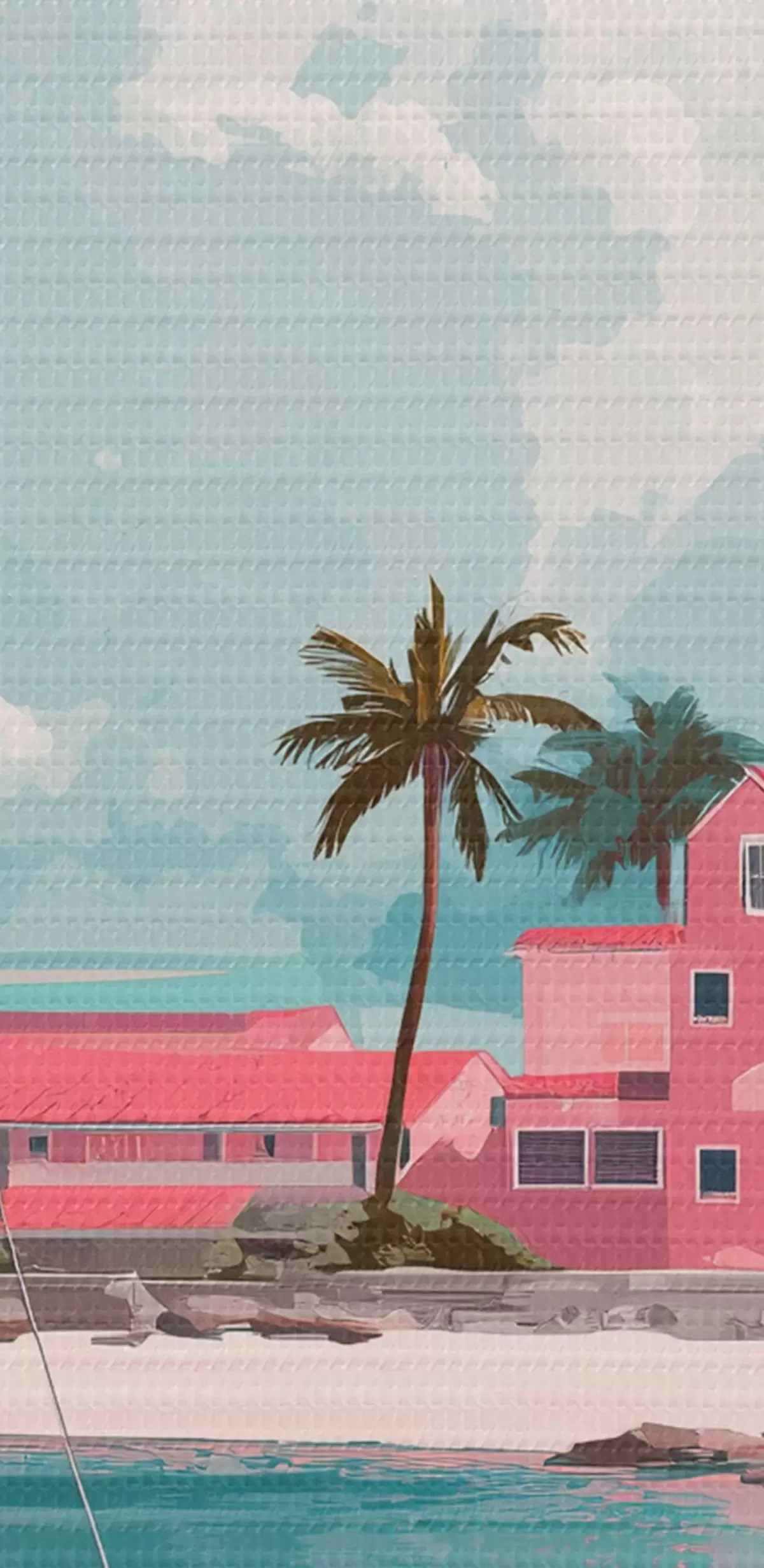 carta da parati Spiaggia rosa con sole splendente, barca a vela e case nr. s44986