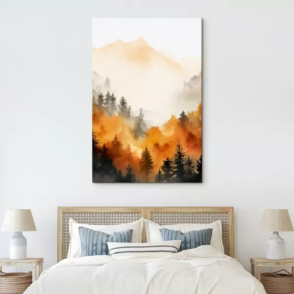 Quadri Un paesaggio dipinto ad acquerello imitazione di una foresta con alti pini e montagne sullo sfondo Nr s45169