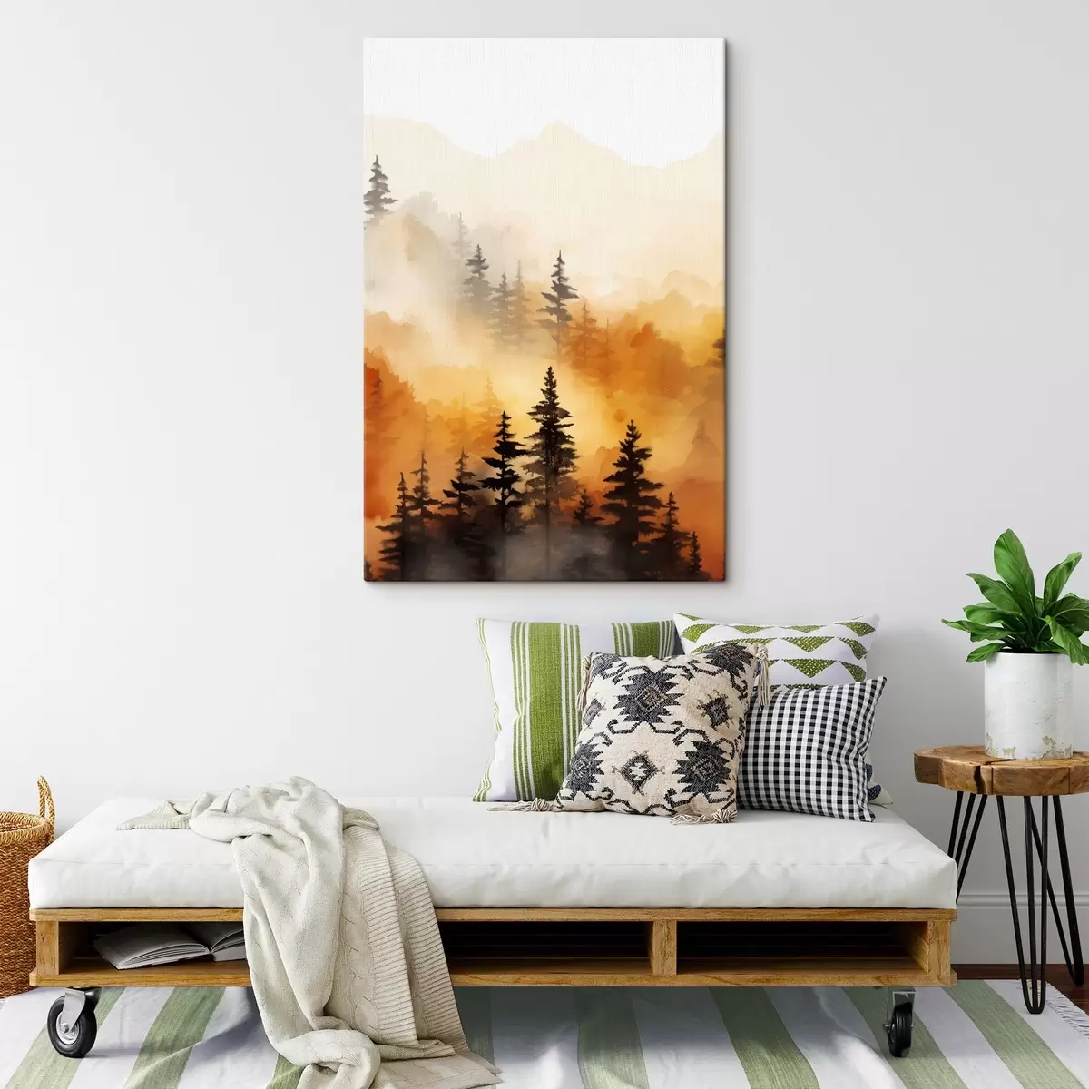 Quadri Un paesaggio dipinto ad acquerello imitazione di una foresta con alti pini e montagne sullo sfondo Nr s45170