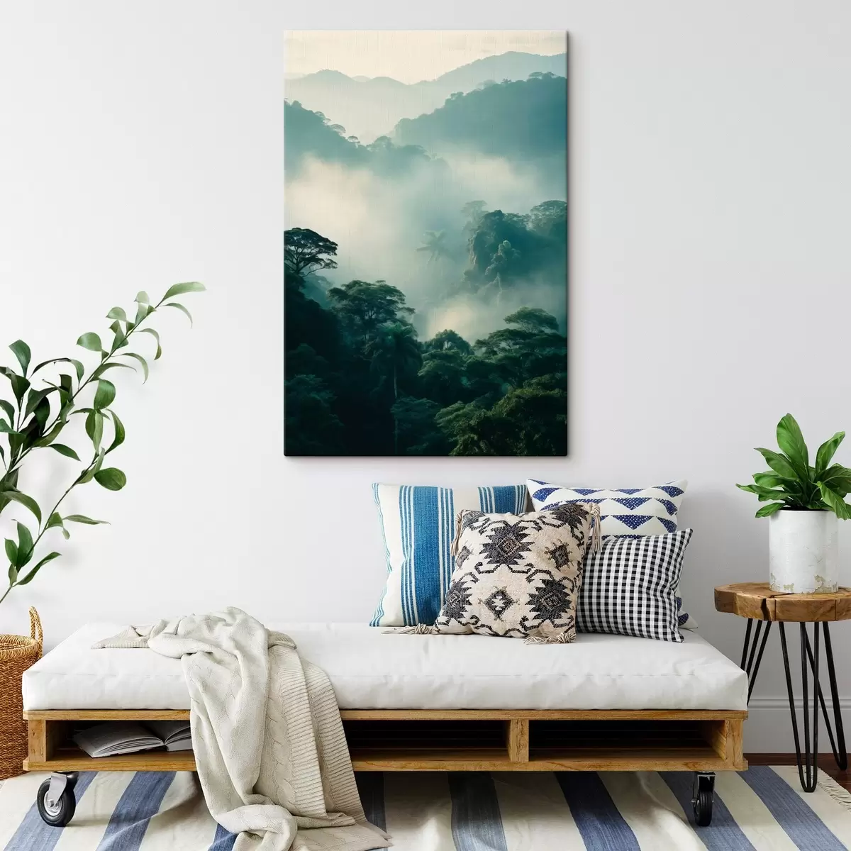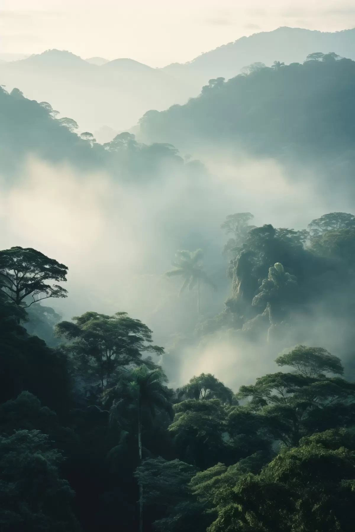 Quadri Foresta pluviale tropicale con alberi verdi e uno spesso strato di nebbia che crea un ambiente suggestivo Nr s45189