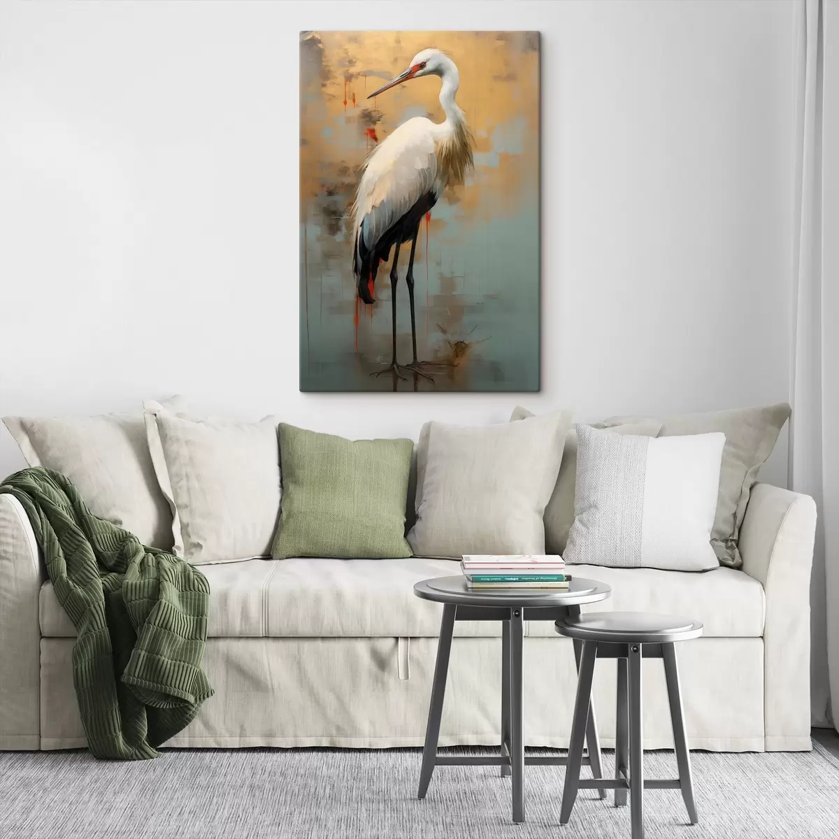 Quadri Airone bianco su uno sfondo di sfumature gialle, marroni e blu che suggeriscono un paesaggio nebbioso e astratto Nr s45191