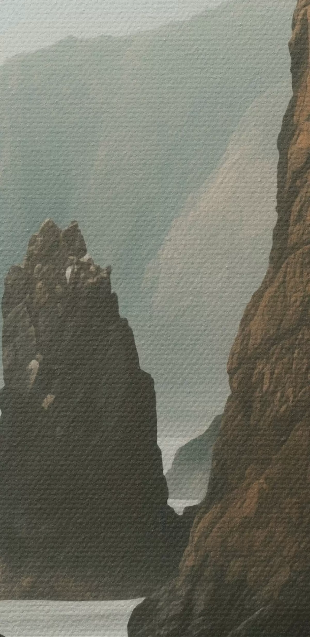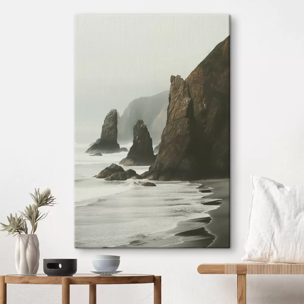 Quadri Scogliere rocciose e costa marina, onde che si infrangono sulla riva, paesaggio dall'atmosfera lunatica, toni terrosi Nr s45193