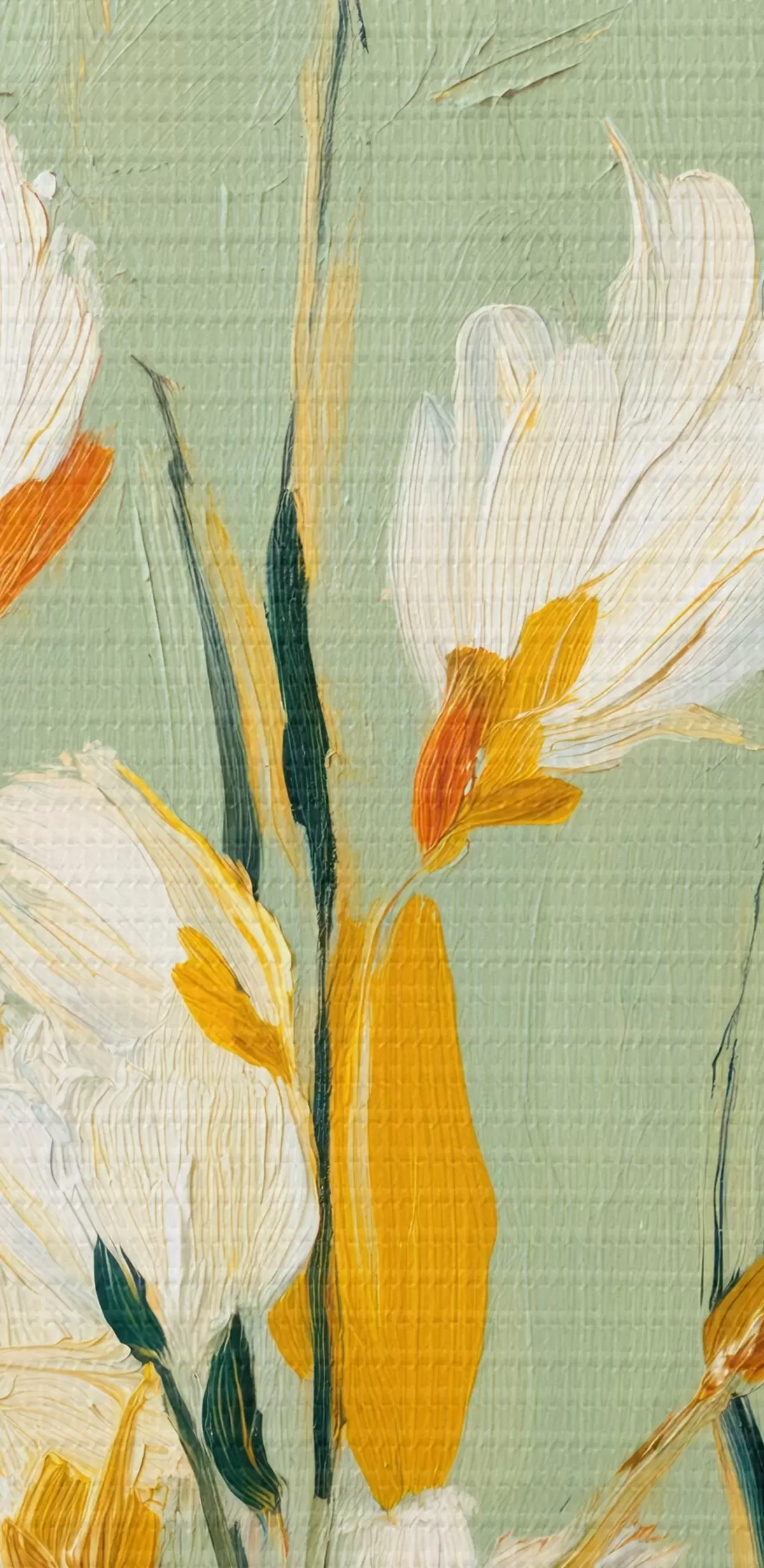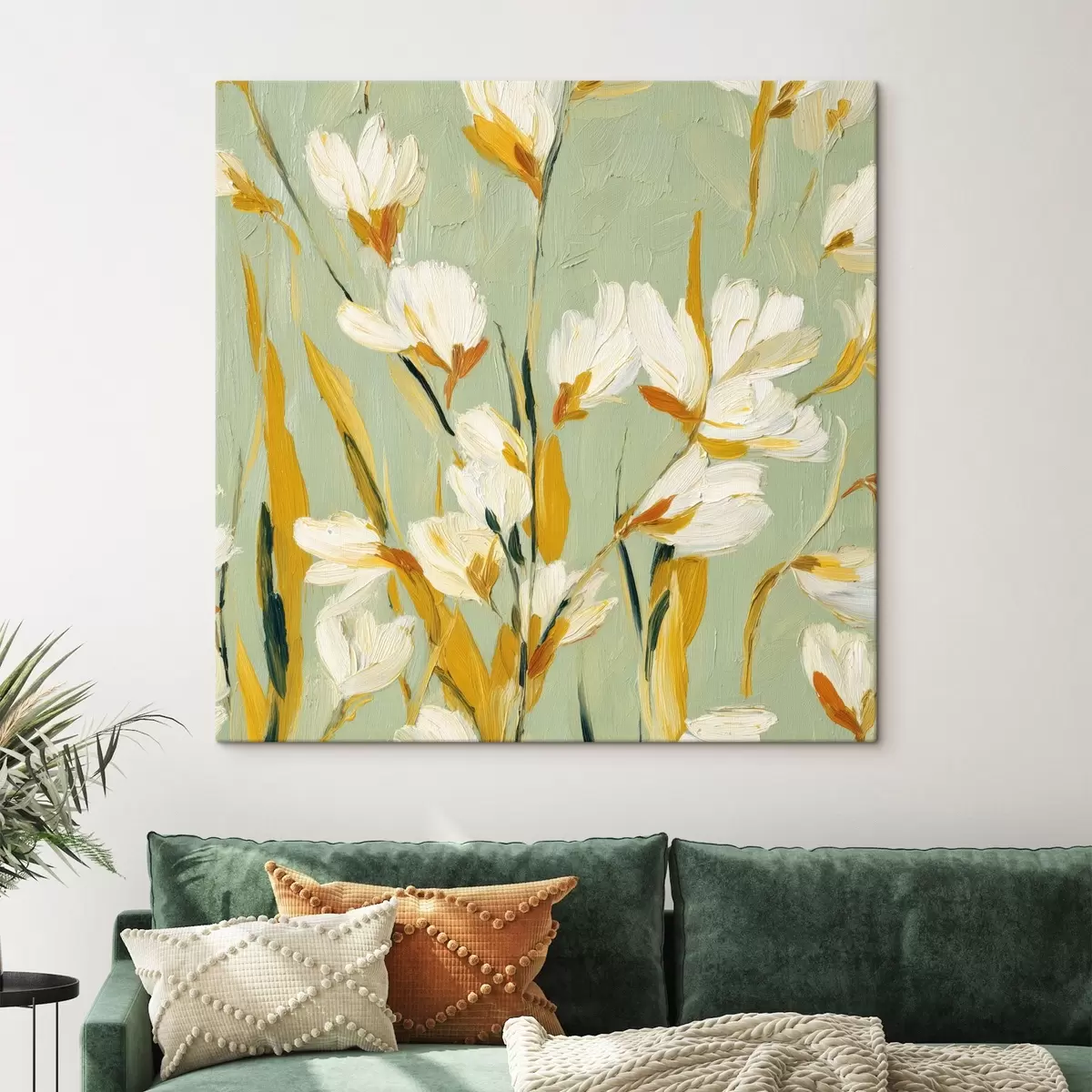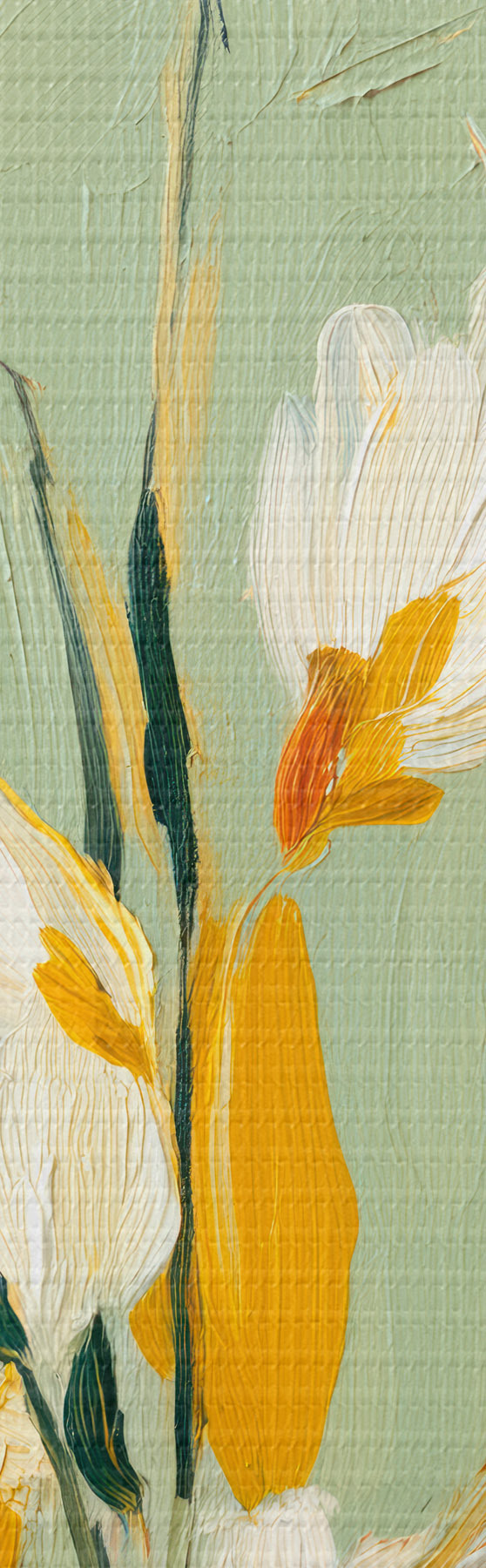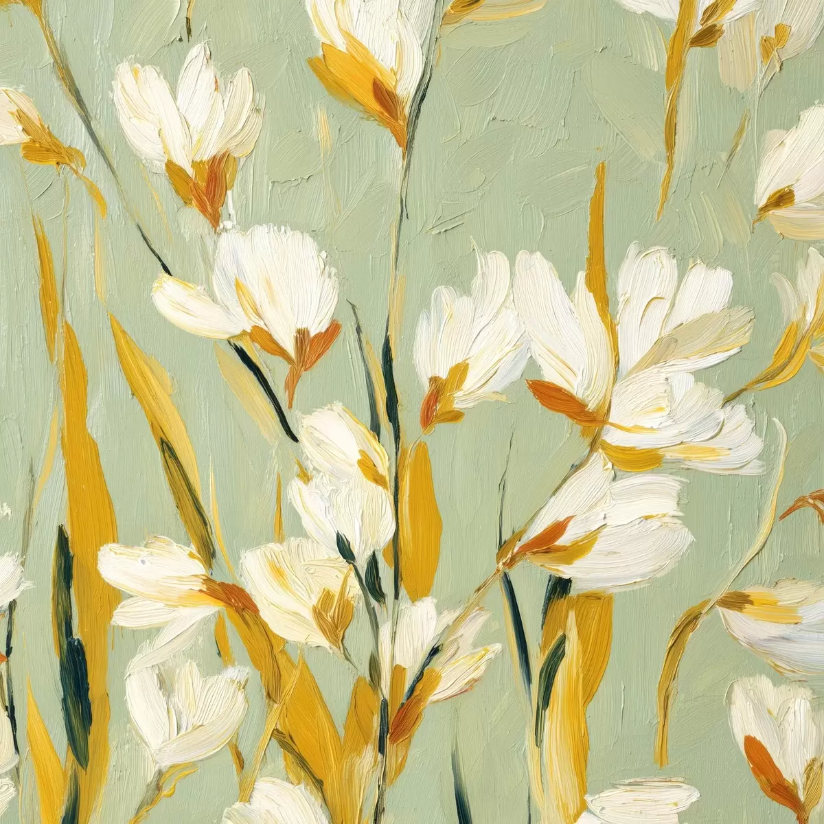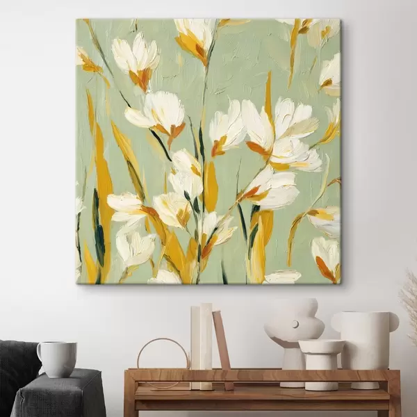Quadri Fiori bianchi con accenti gialli su sfondo menta in stile pennellata Nr s45264
