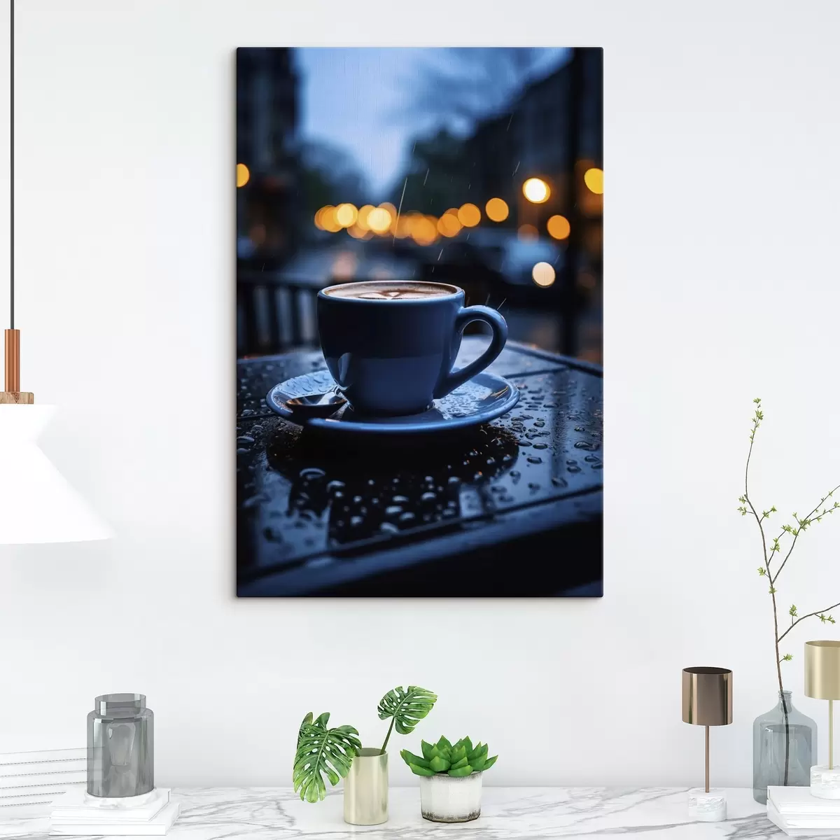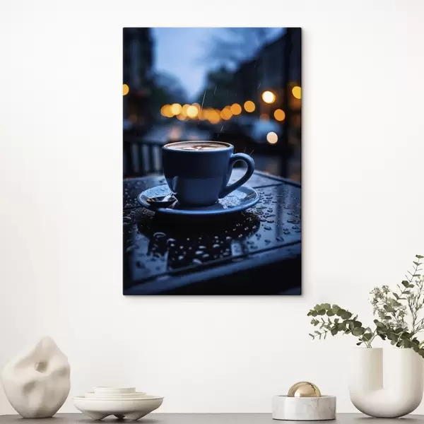 Quadri Una tazza di caffè sul tavolo sotto la pioggia Nr s45497
