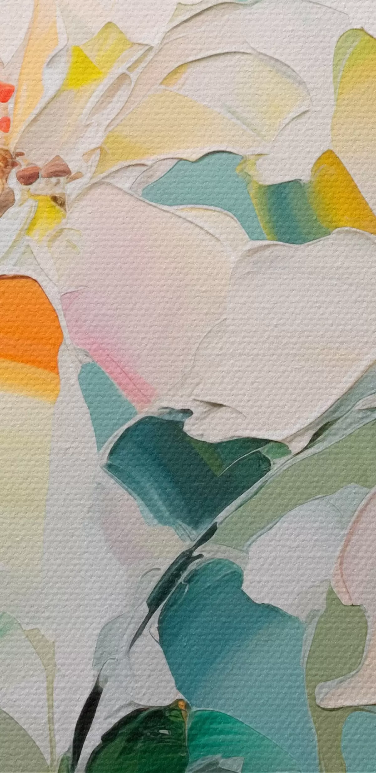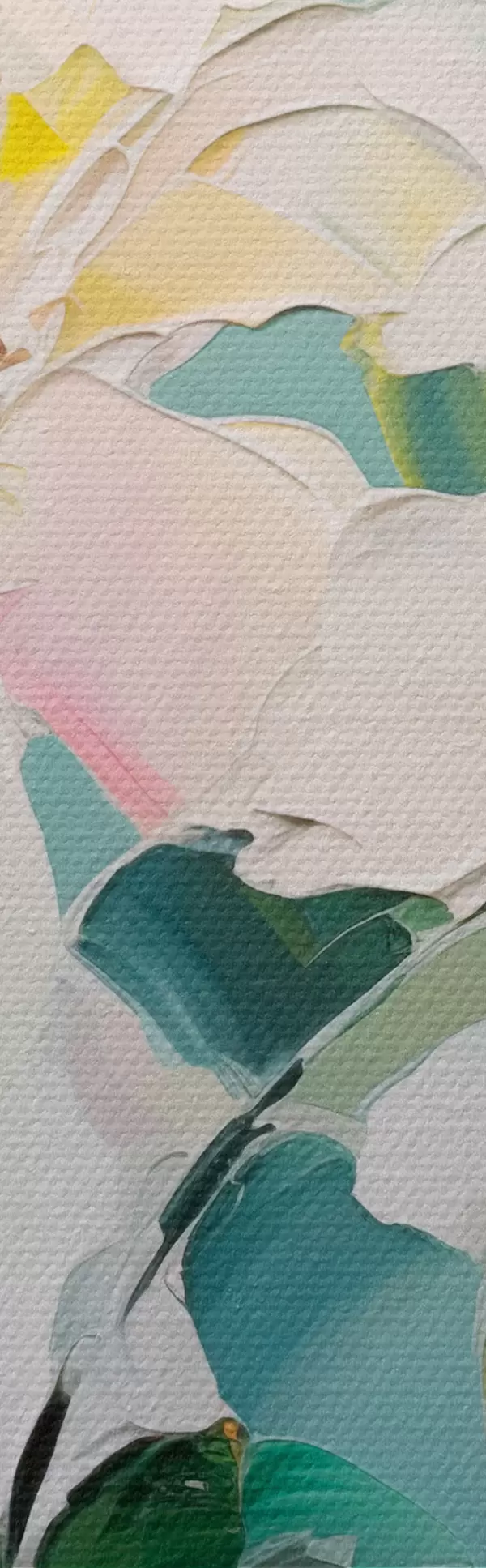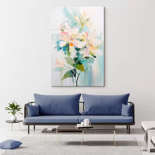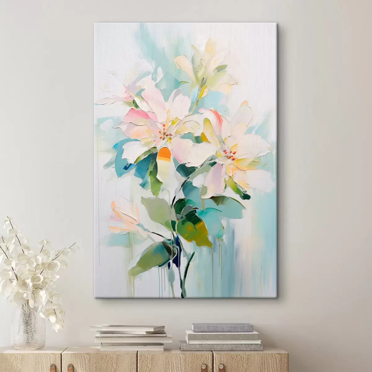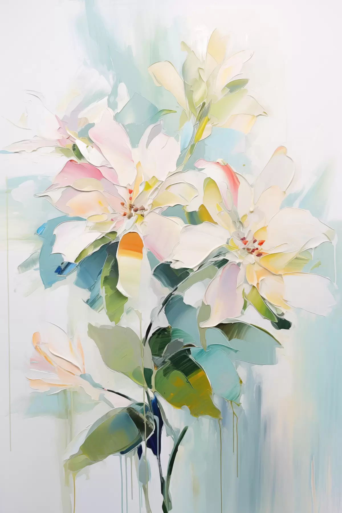 Quadri Fiori con accenti colorati, foglie verdi, imitazione di pittura ad olio con pennellate morbide, sfondo blu chiaro Nr s45549