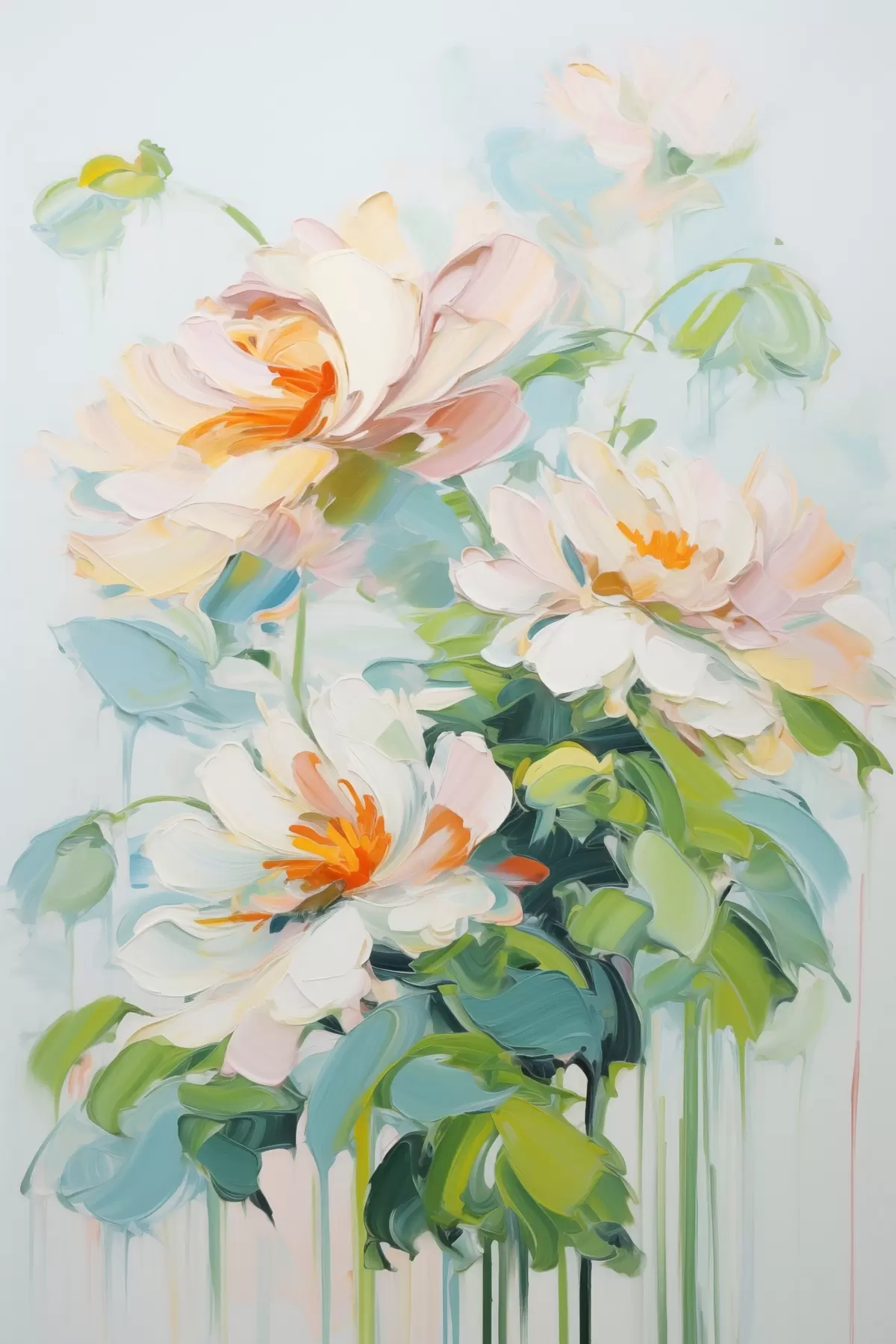 Quadri Fiori di pesco bianchi e pastello, foglie verdi, imitazione di pittura ad olio con pennellate morbide, sfondo blu chiaro Nr s45550