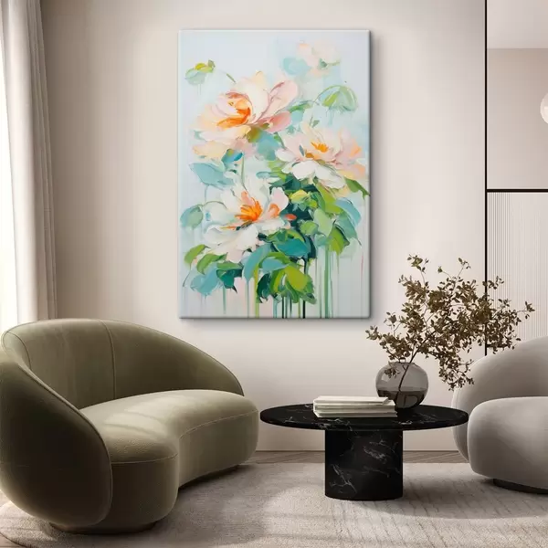 Quadri Fiori di pesco bianchi e pastello, foglie verdi, imitazione di pittura ad olio con pennellate morbide, sfondo blu chiaro Nr s45550