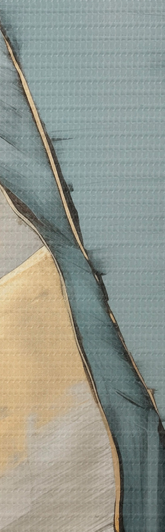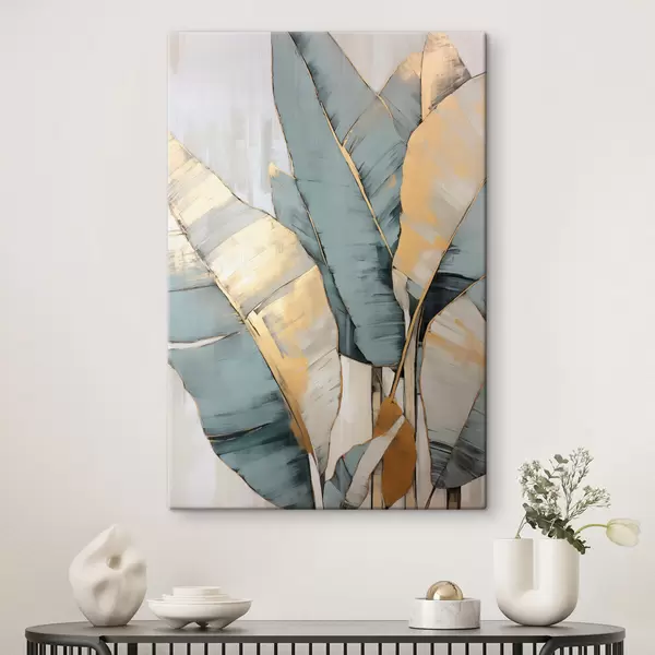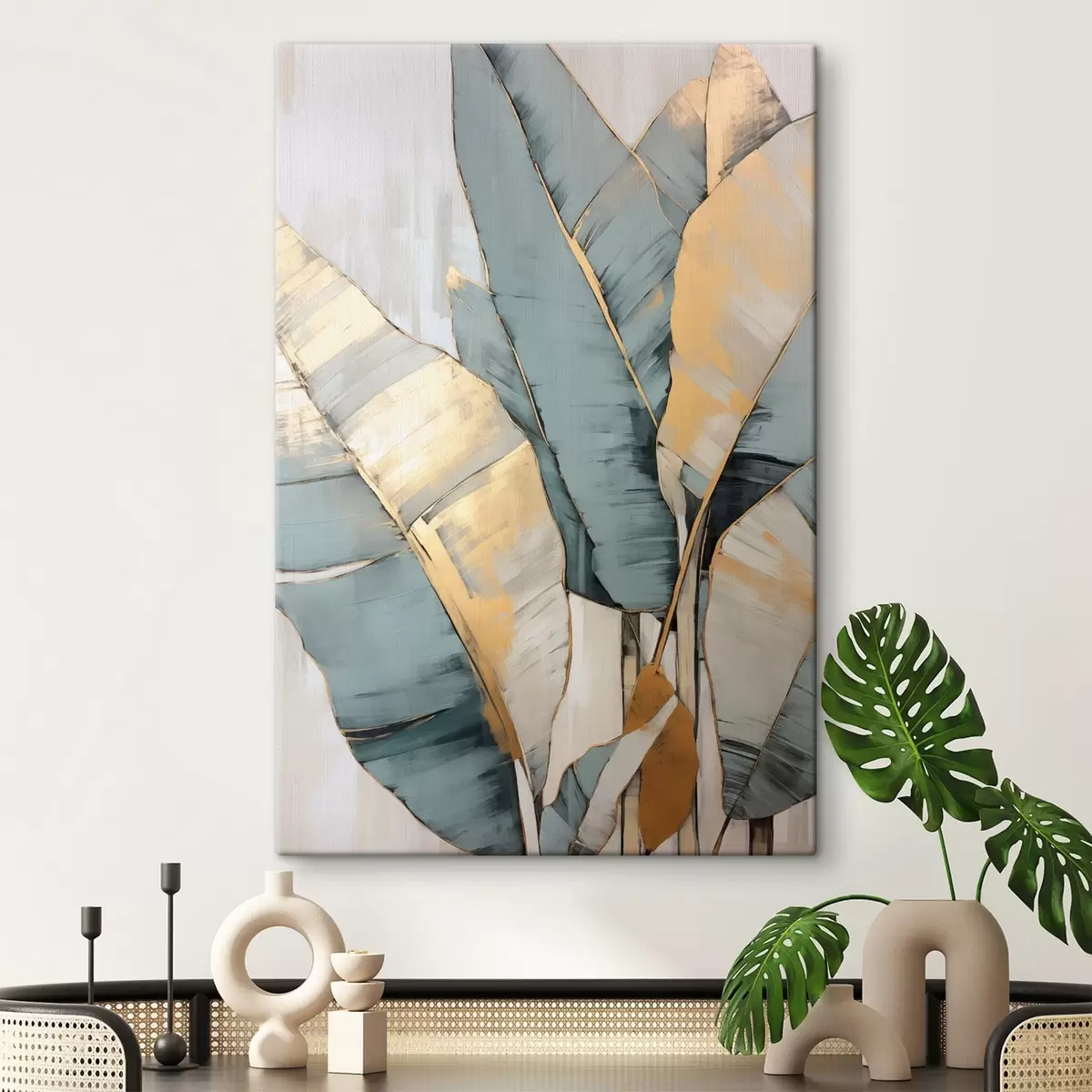 Quadri Foglie di banano blu, grigie e gialle con pennellate visibili, su uno sfondo bianco astratto Nr s45552