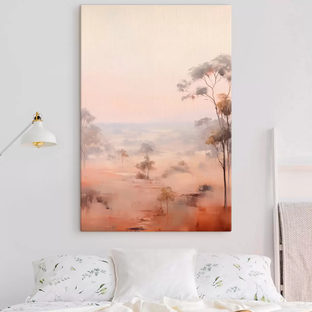 Quadri Un paesaggio con cespugli e alberi nei toni pastello del rosa, dell'arancione e del marrone, con le montagne sullo sfondo Nr s45554