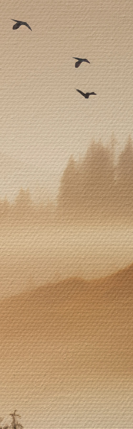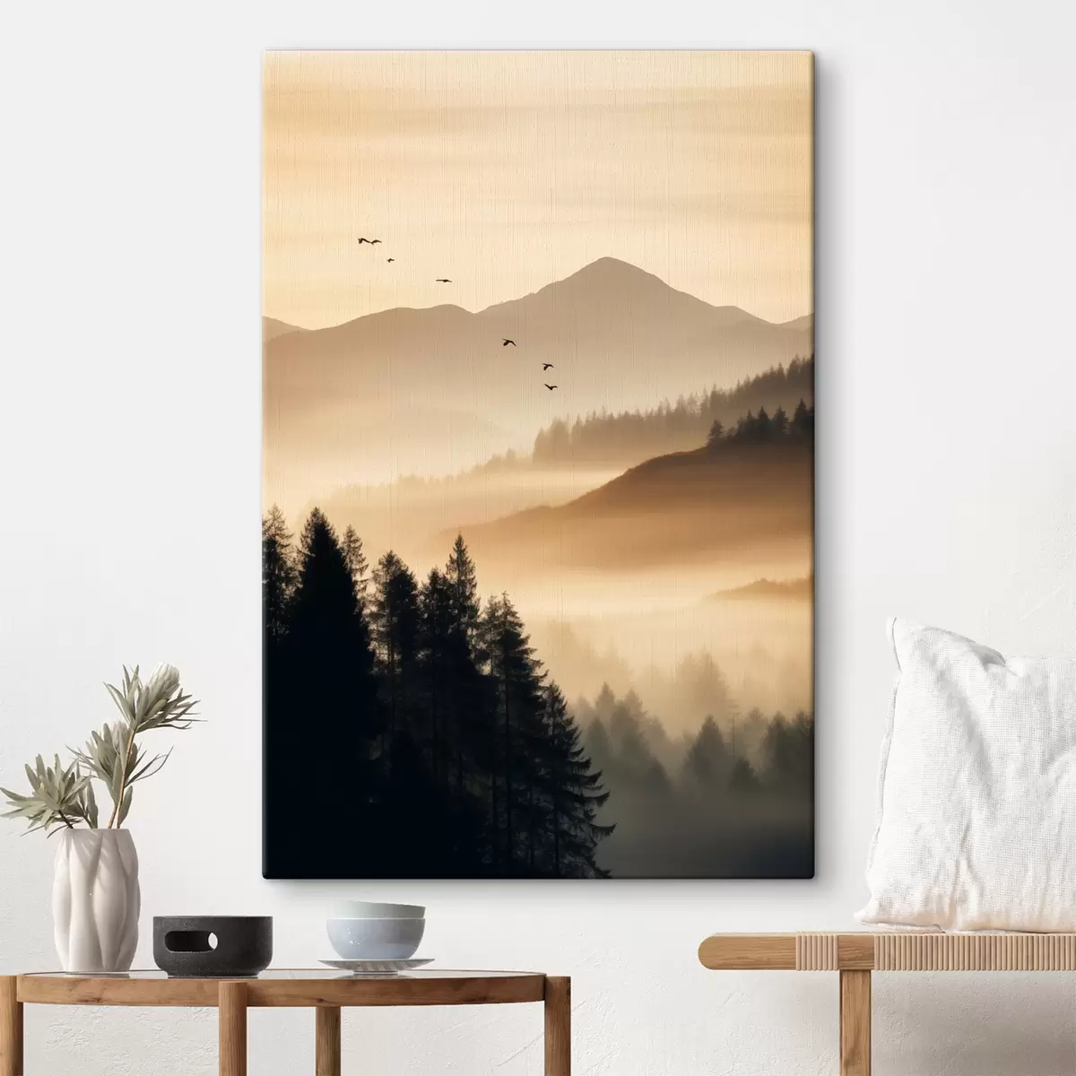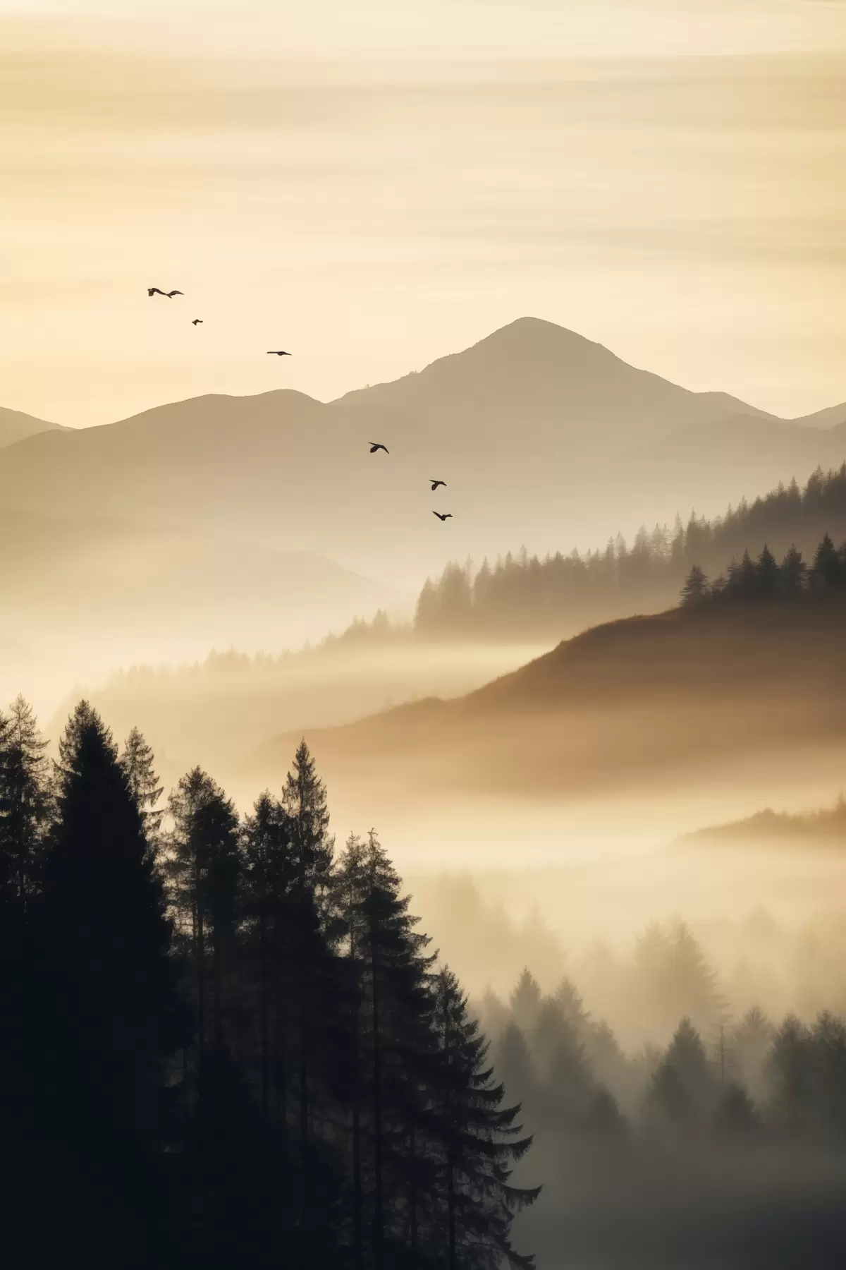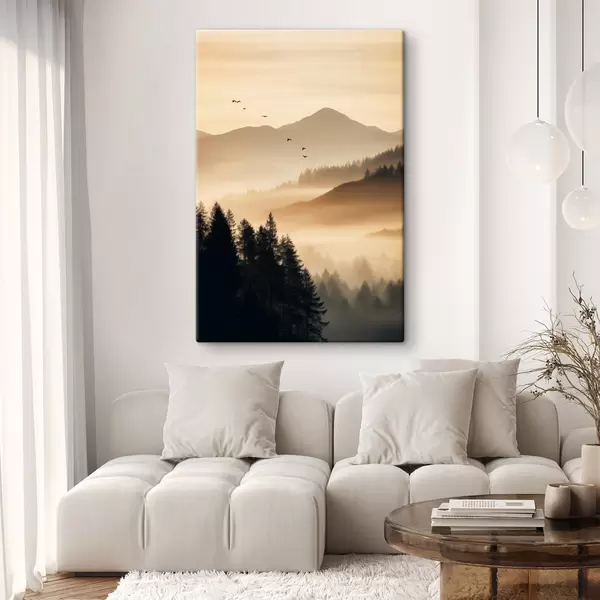 Quadri Un paesaggio montano con una foresta e uccelli che volano nel cielo, il tutto coperto da uno spesso strato di nebbia durante l'alba Nr s45563