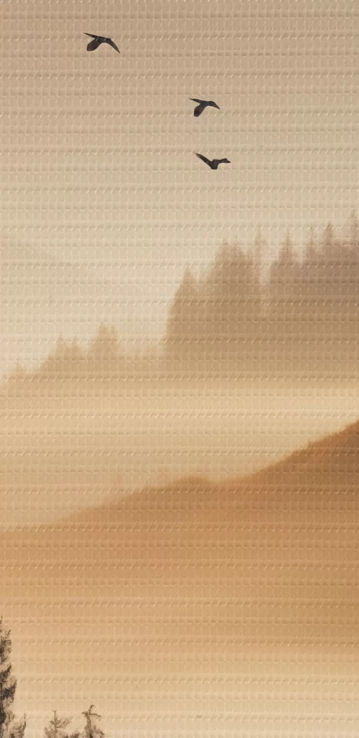carta da parati Un paesaggio montano con una foresta e uccelli che volano nel cielo, il tutto coperto da uno spesso strato di nebbia durante l'alba nr. s45563