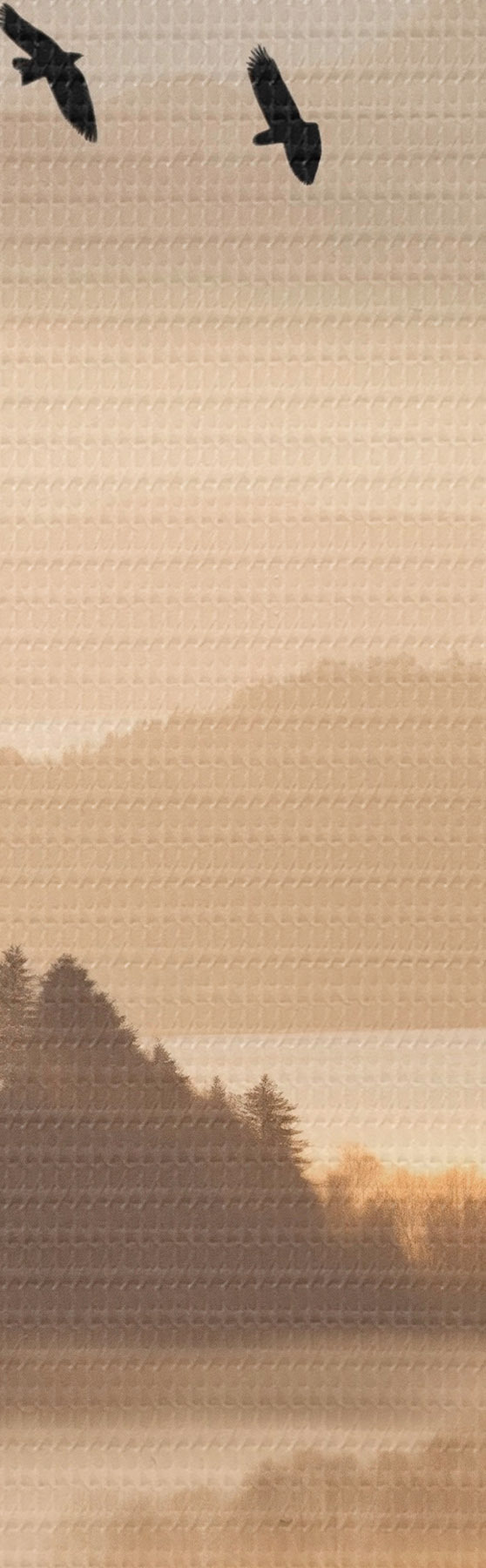 Quadri Un paesaggio montano con una foresta e uccelli che volano nel cielo, il tutto coperto da uno spesso strato di nebbia durante l'alba Nr s45564