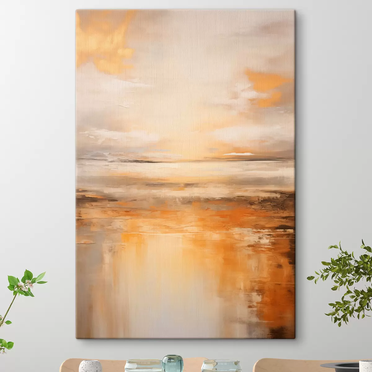 Quadri Un dipinto astratto di un paesaggio di spiaggia con un oceano calmo, sabbia arancione e un cielo nuvoloso con sole Nr s45567