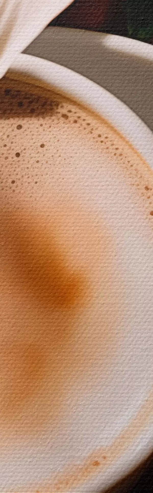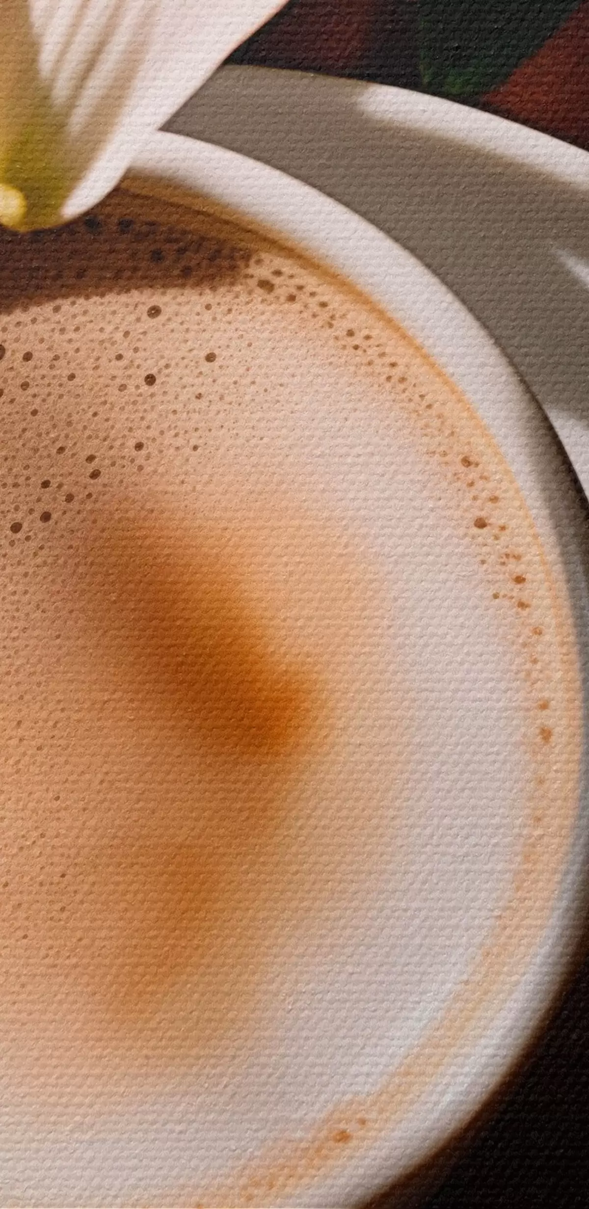 Quadri Una tazza di caffè con schiuma su un piatto bianco, alcuni fiori sullo sfondo, con la luce del sole Nr s45569