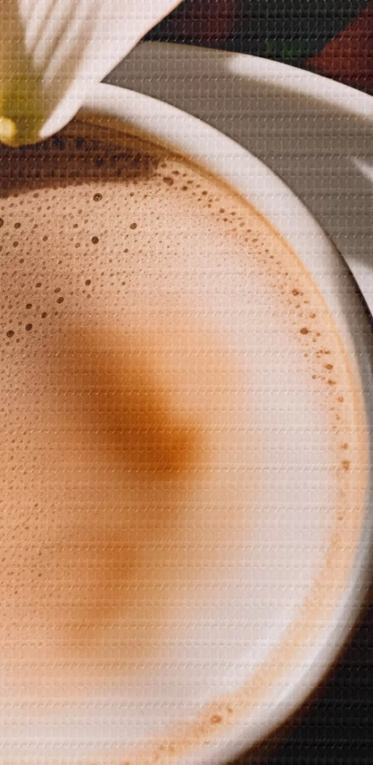 carta da parati Una tazza di caffè con schiuma su un piatto bianco, alcuni fiori sullo sfondo, con la luce del sole nr. s45569