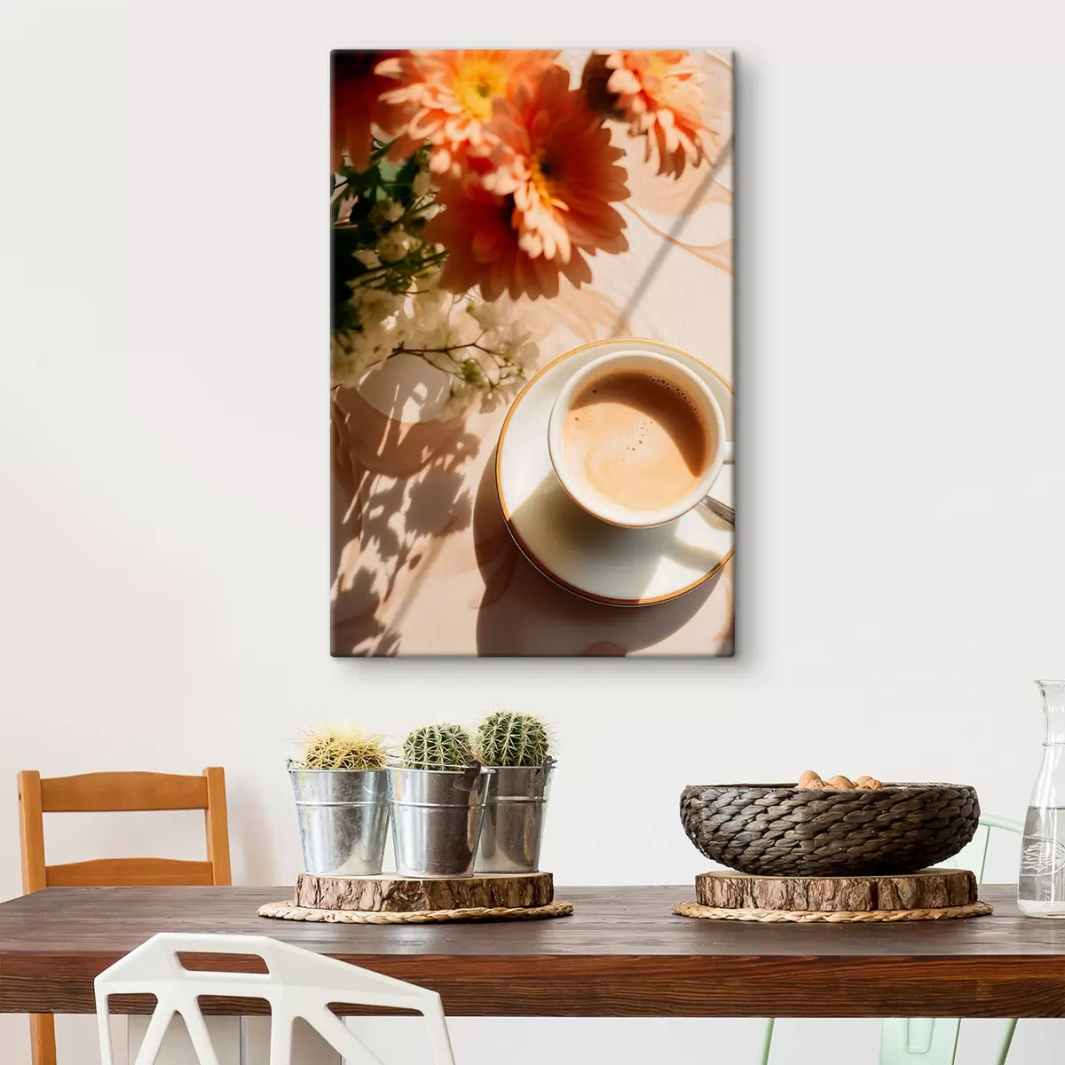 Quadri Una tazza di caffè con schiuma su un piatto bianco, alcuni fiori sullo sfondo, con la luce del sole Nr s45570