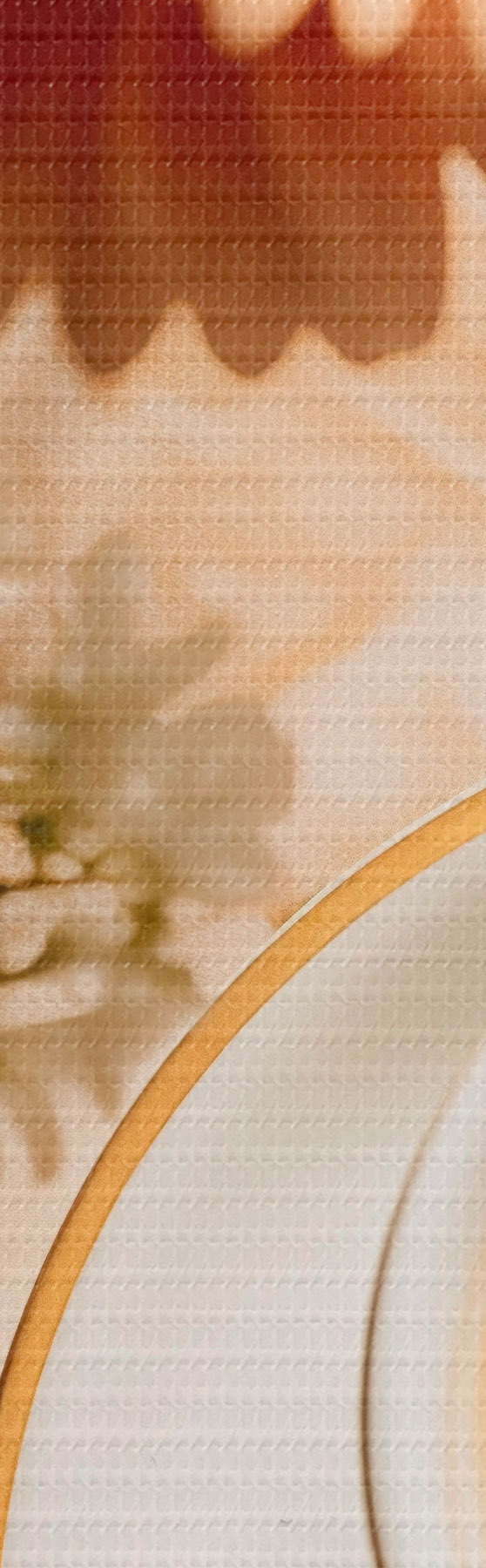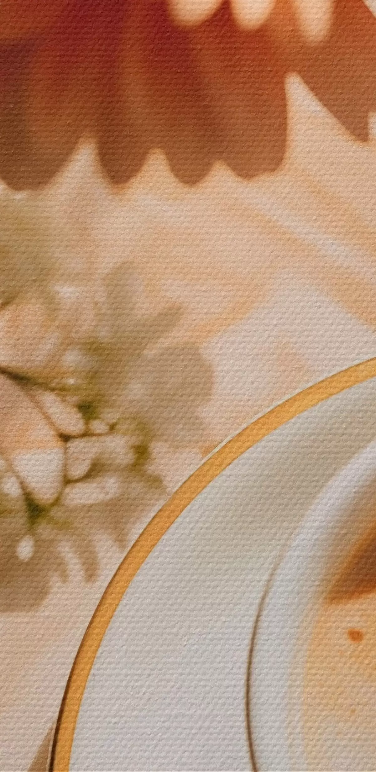 carta da parati Una tazza di caffè con schiuma su un piatto bianco, alcuni fiori sullo sfondo, con la luce del sole nr. s45570