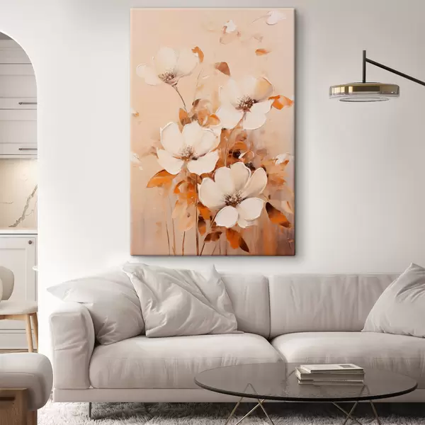 Quadri Fiori bianchi con foglie arancioni, pennellate delicate, tavolozza di colori caldi, composizione elegante Nr s45573