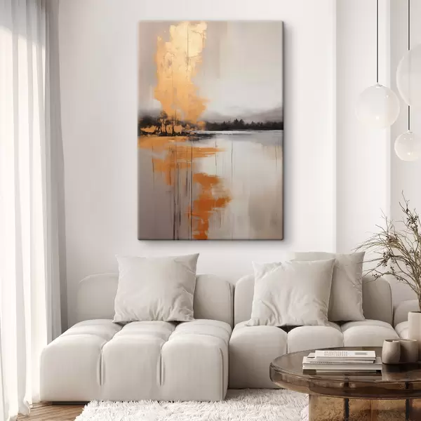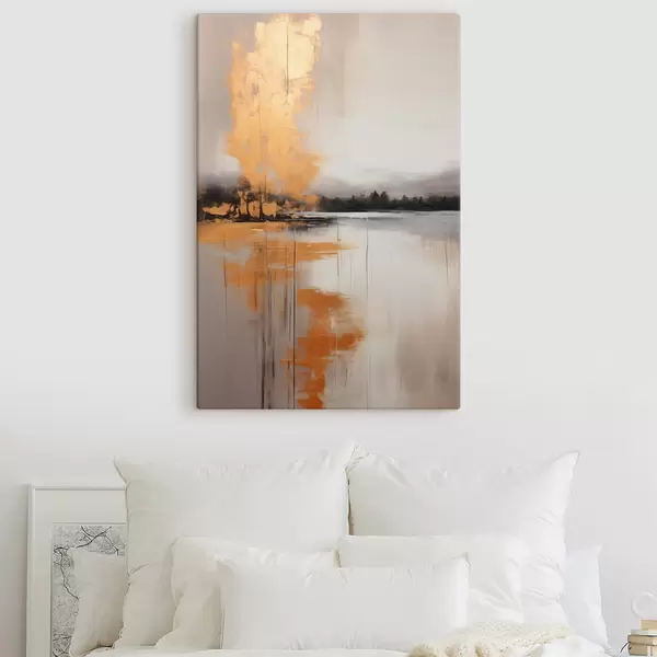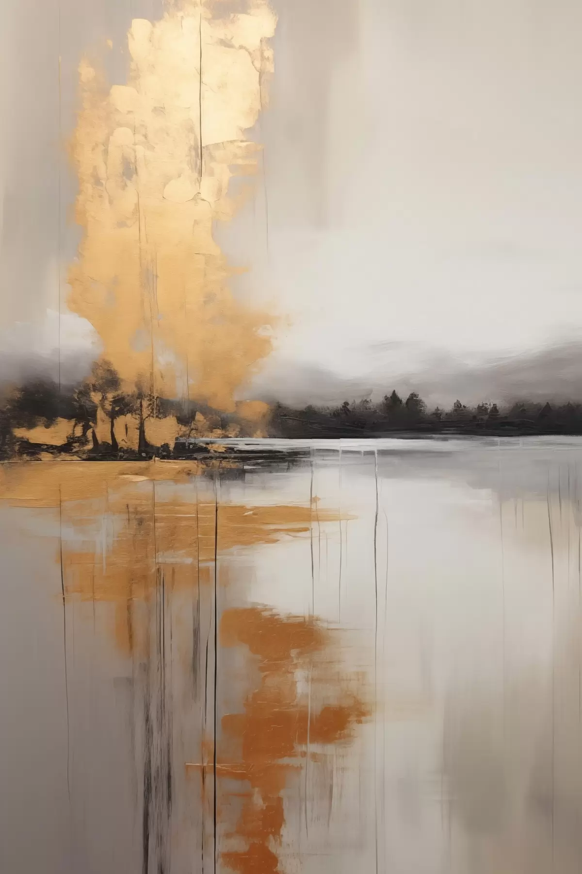 Quadri Un paesaggio astratto con un lago, un albero e la nebbia gialla, l'acqua riflette e il cielo nuvoloso Nr s45575