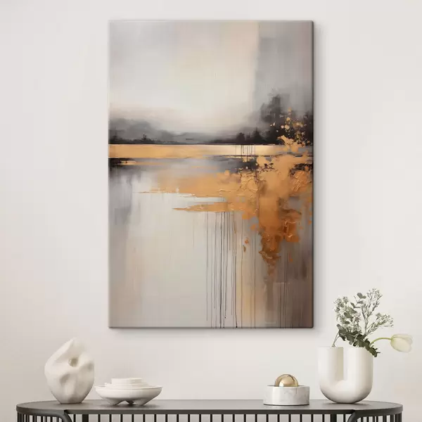 Quadri Paesaggio astratto strutturato con un fiume e alberi scuri sullo sfondo, il cielo è nuvoloso Nr s45576