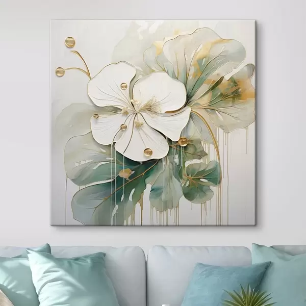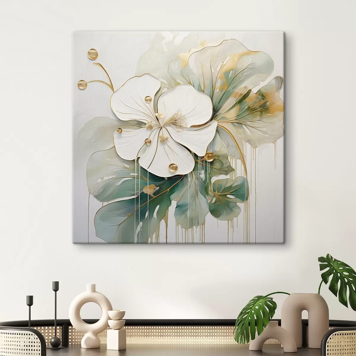 Quadri Un fiore bianco con dettagli giallo-arancio e foglie verdi Nr s45815