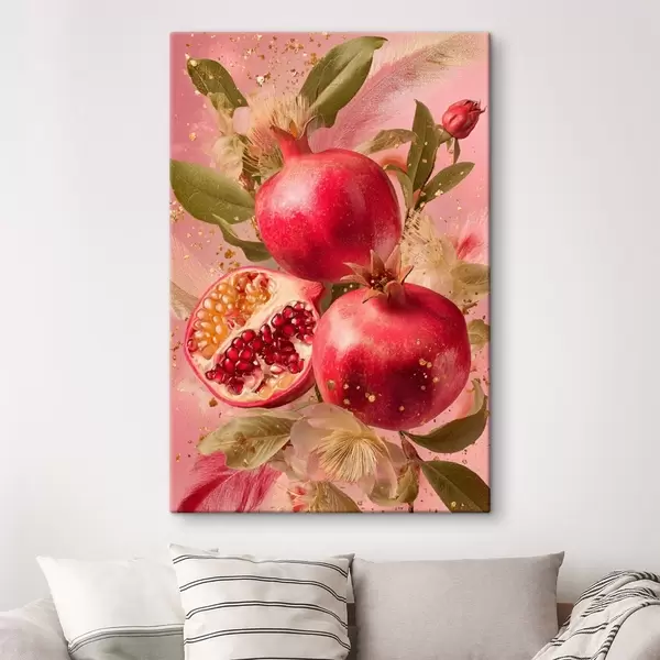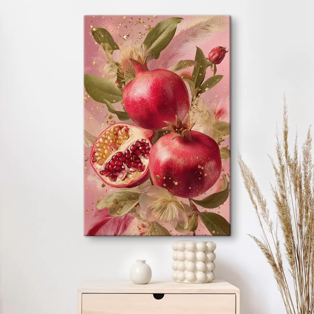 Quadri Meloni maturi su sfondo rosa con foglie e macchie Nr s45868