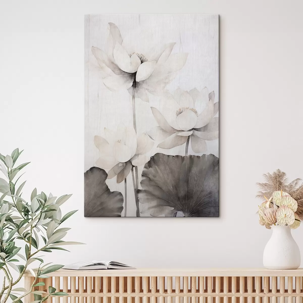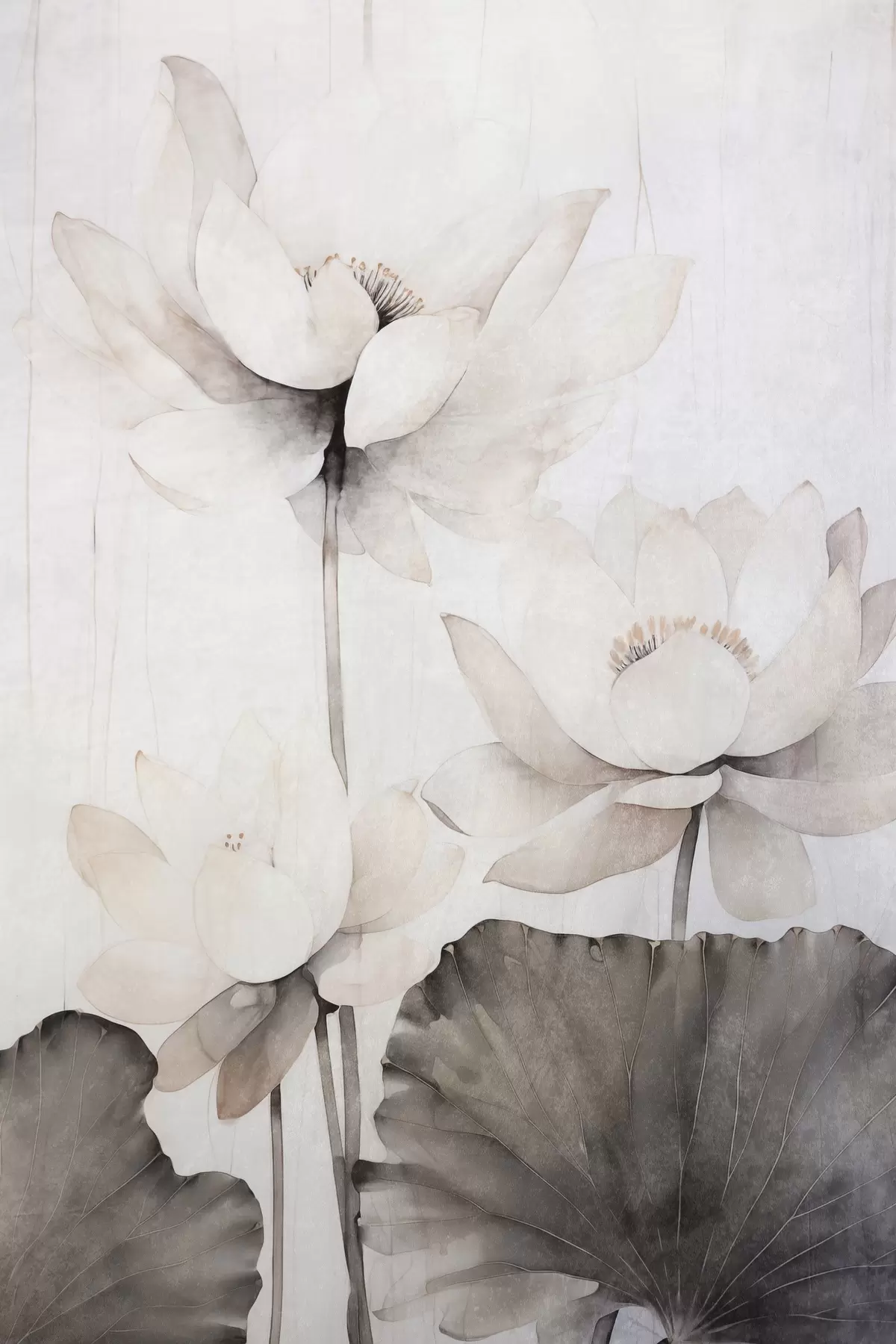 Quadri Fiori di loto bianchi con foglie scure, sfondo chiaro, design minimalista Nr s45936