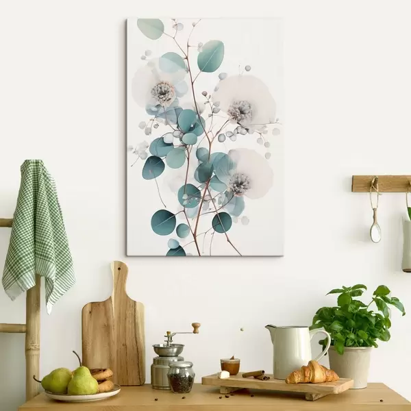 Quadri Fiori astratti di eucalipto con petali bianchi, foglie verde tenue sui rami Nr s45946
