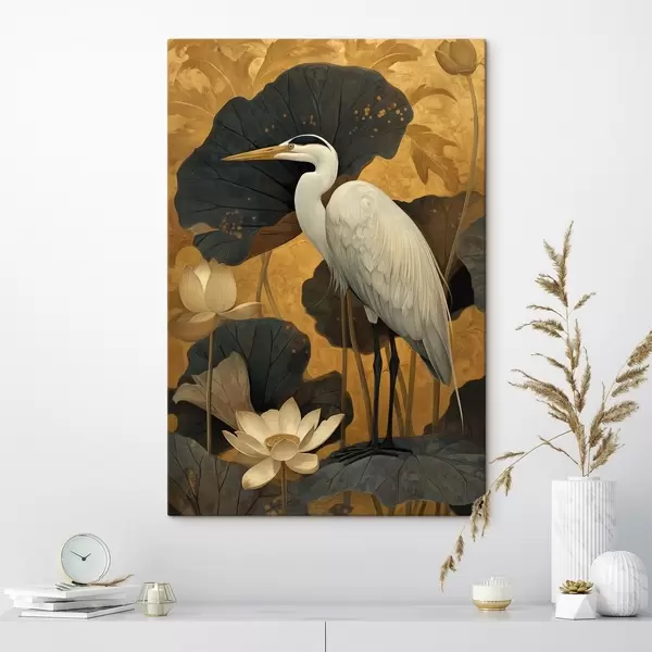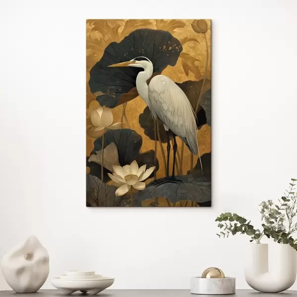 Quadri Airone tra i fiori di loto su uno sfondo caldo Nr s46148