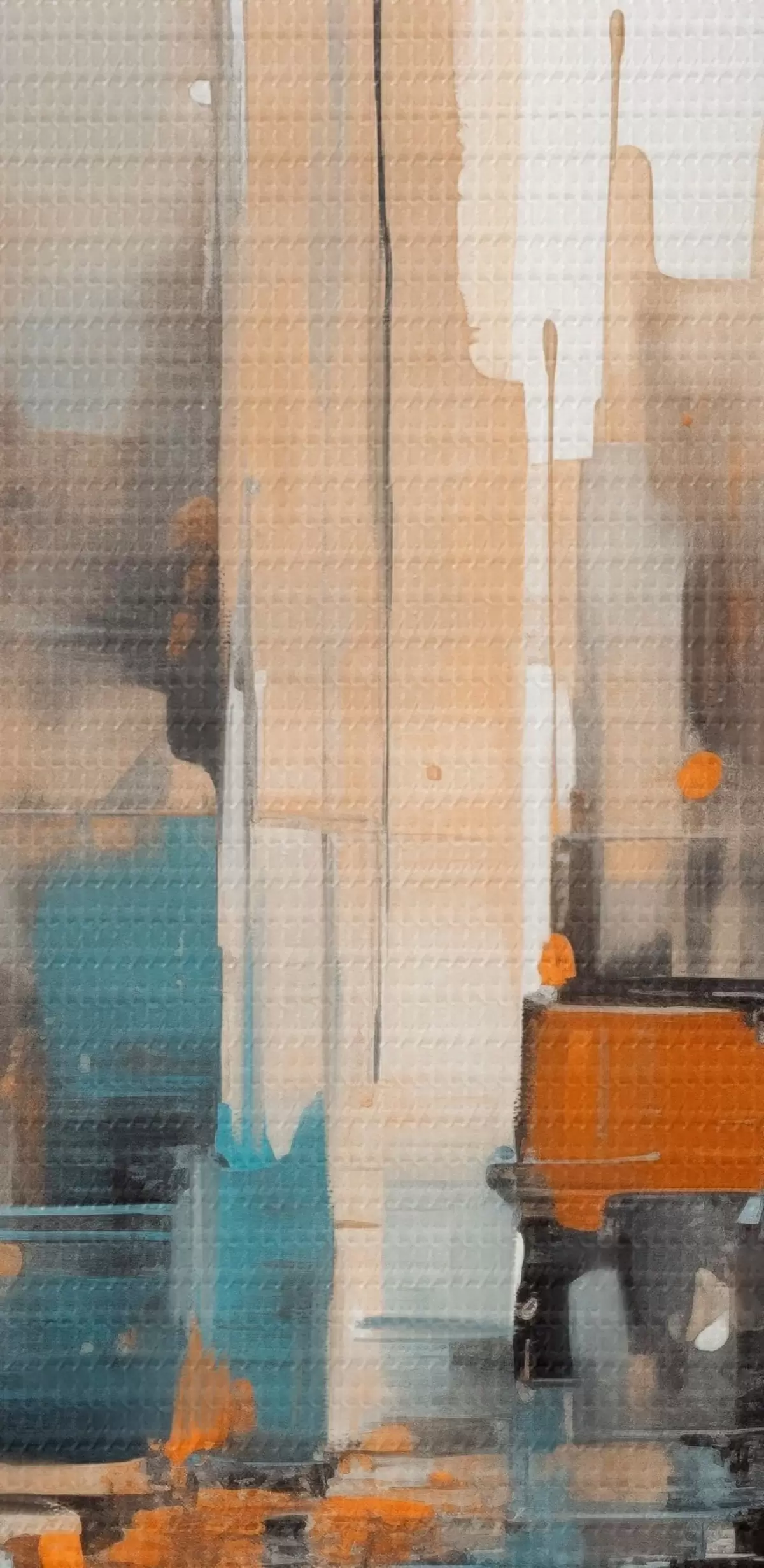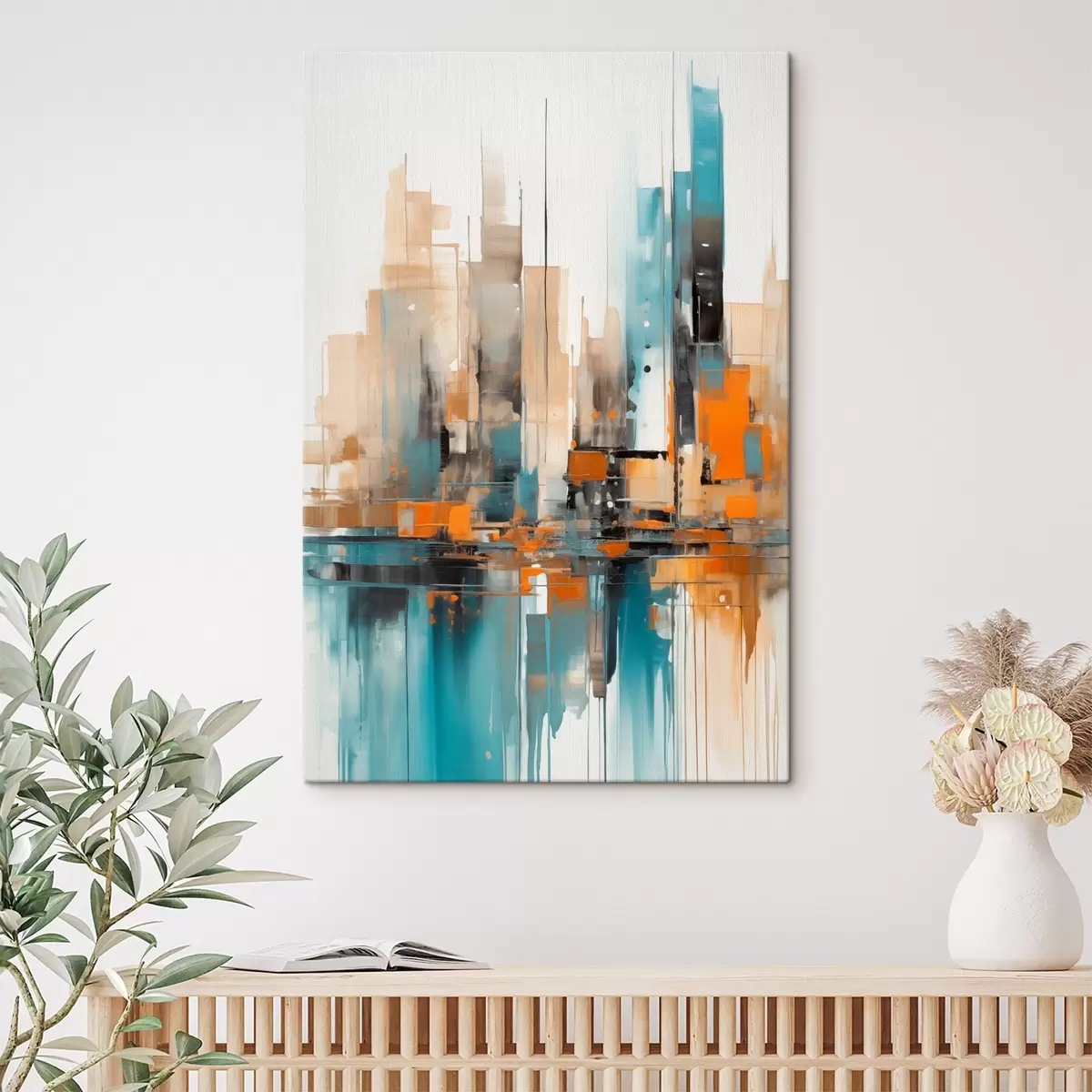 Quadri Paesaggio urbano astratto con pennellate verticali arancioni, verde acqua e marroni e forme geometriche Nr s46266