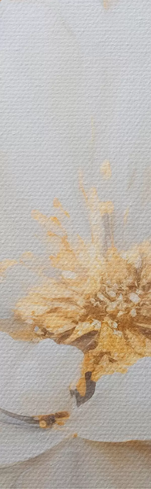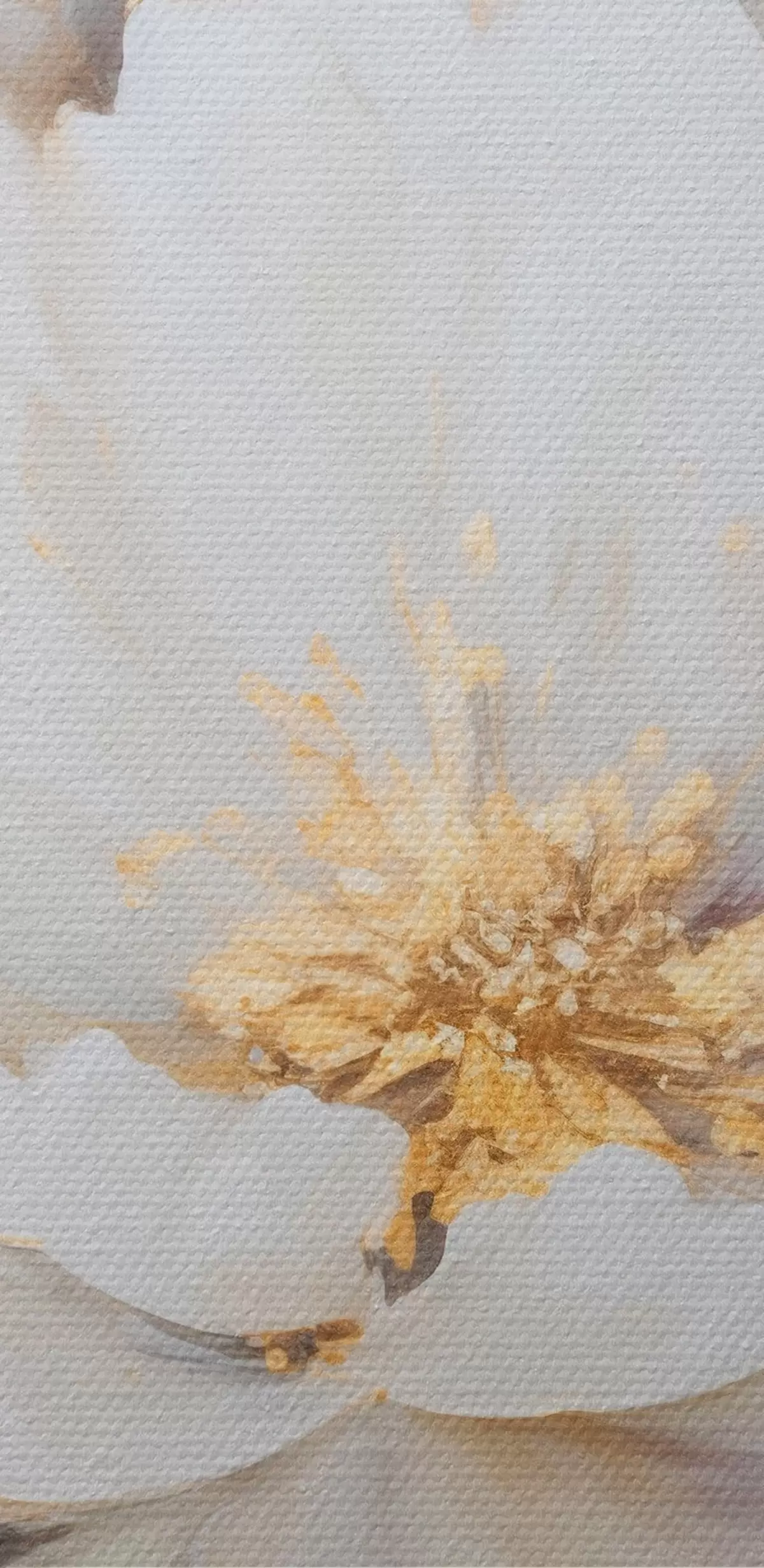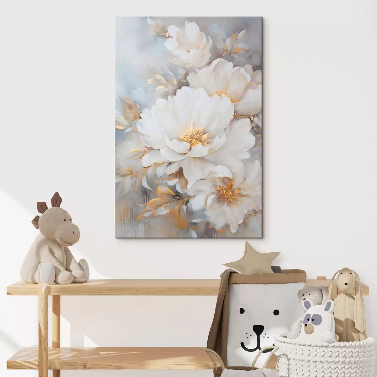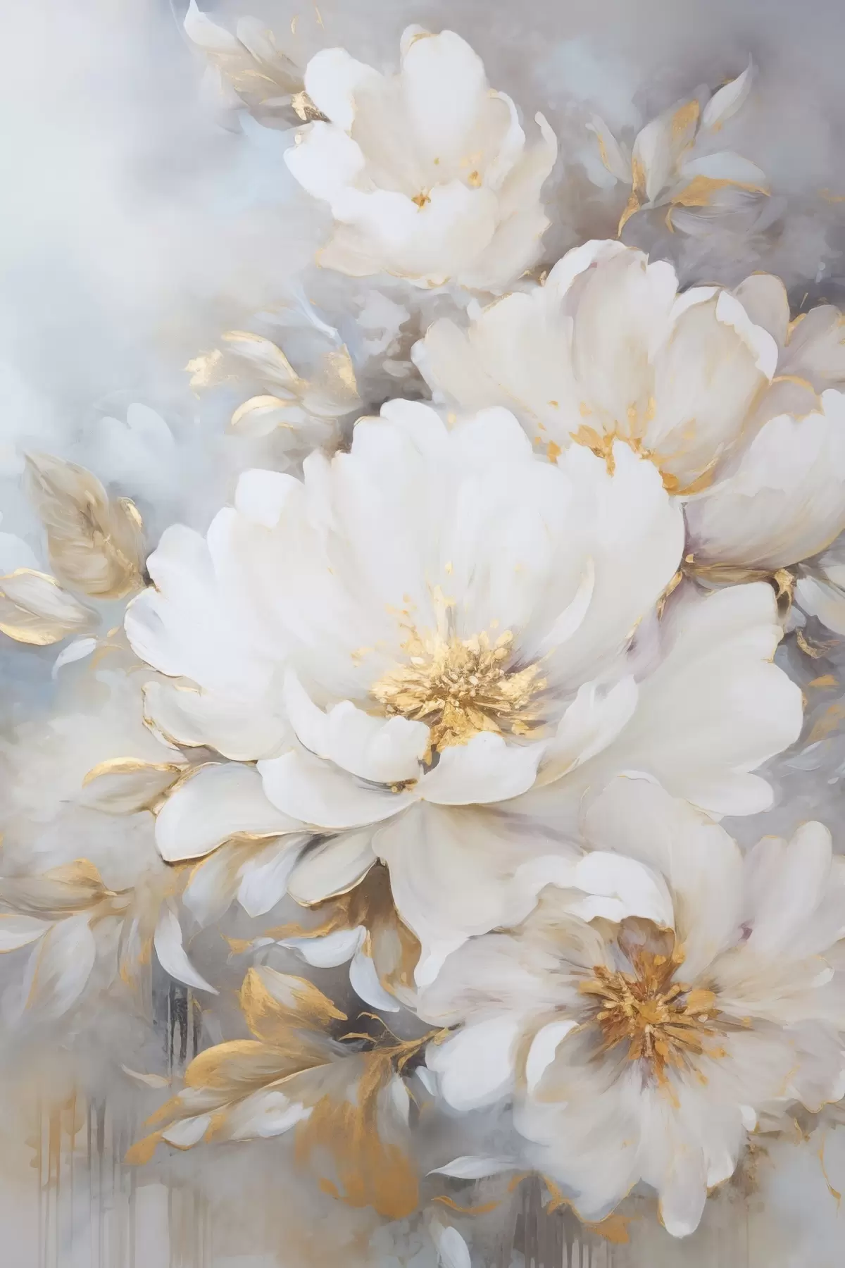 Quadri Peonie bianche con centro e foglie gialle, pennellate morbide, sfondo azzurro, composizione floreale Nr s46271