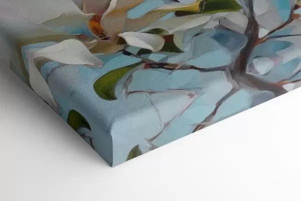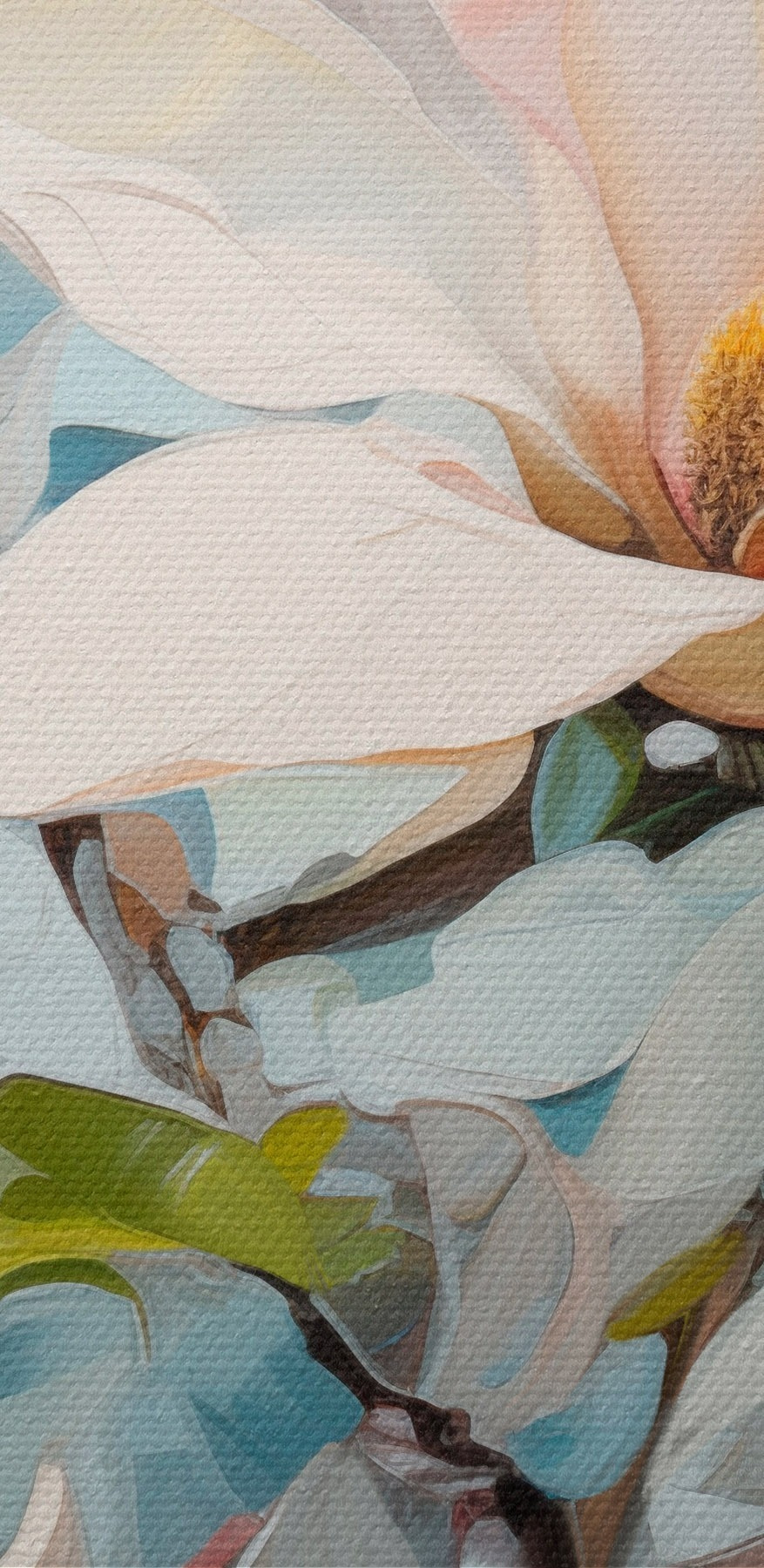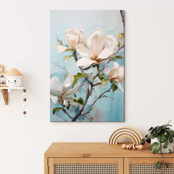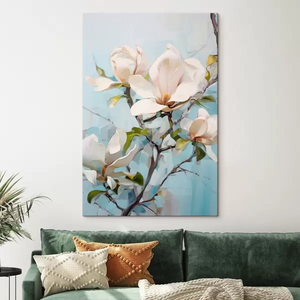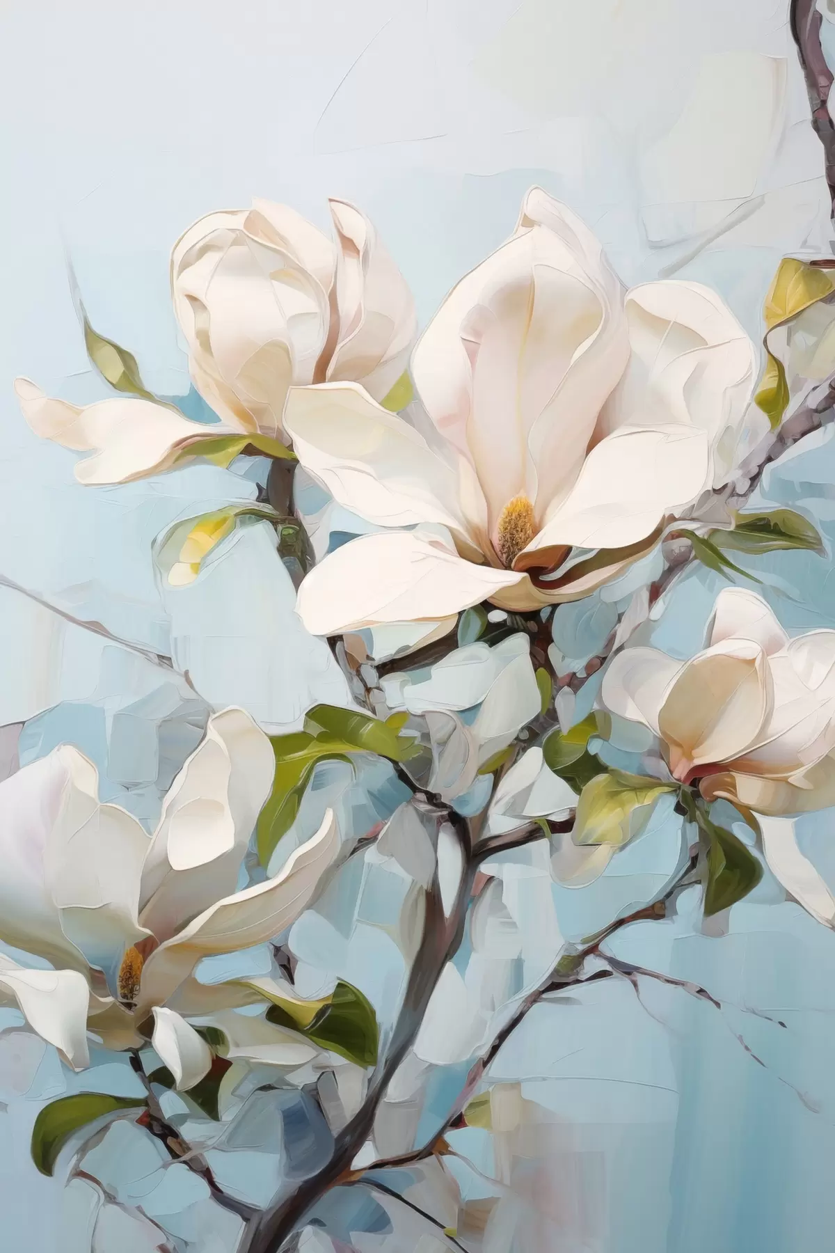 Quadri Fiori di magnolia bianchi, sfondo azzurro con pennellate morbide, stile pittura a olio, texture impastata Nr s46277