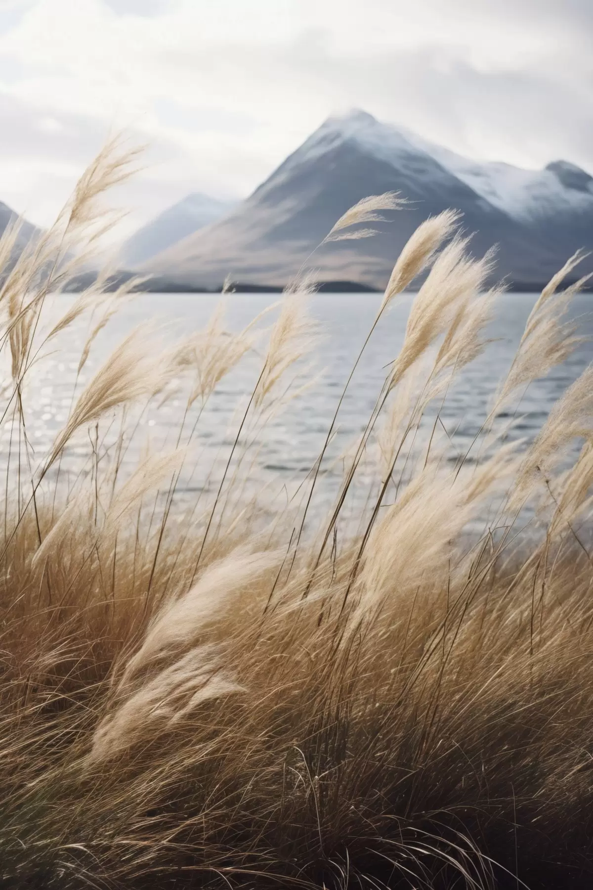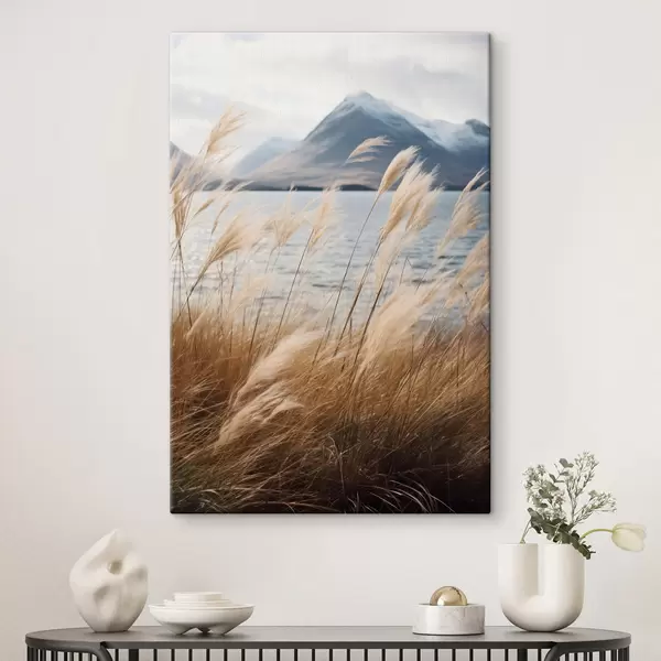 Quadri Erba della Pampa con un lago e montagne sullo sfondo, illuminazione soffusa, colori tenui, stile naturalistico Nr s46283