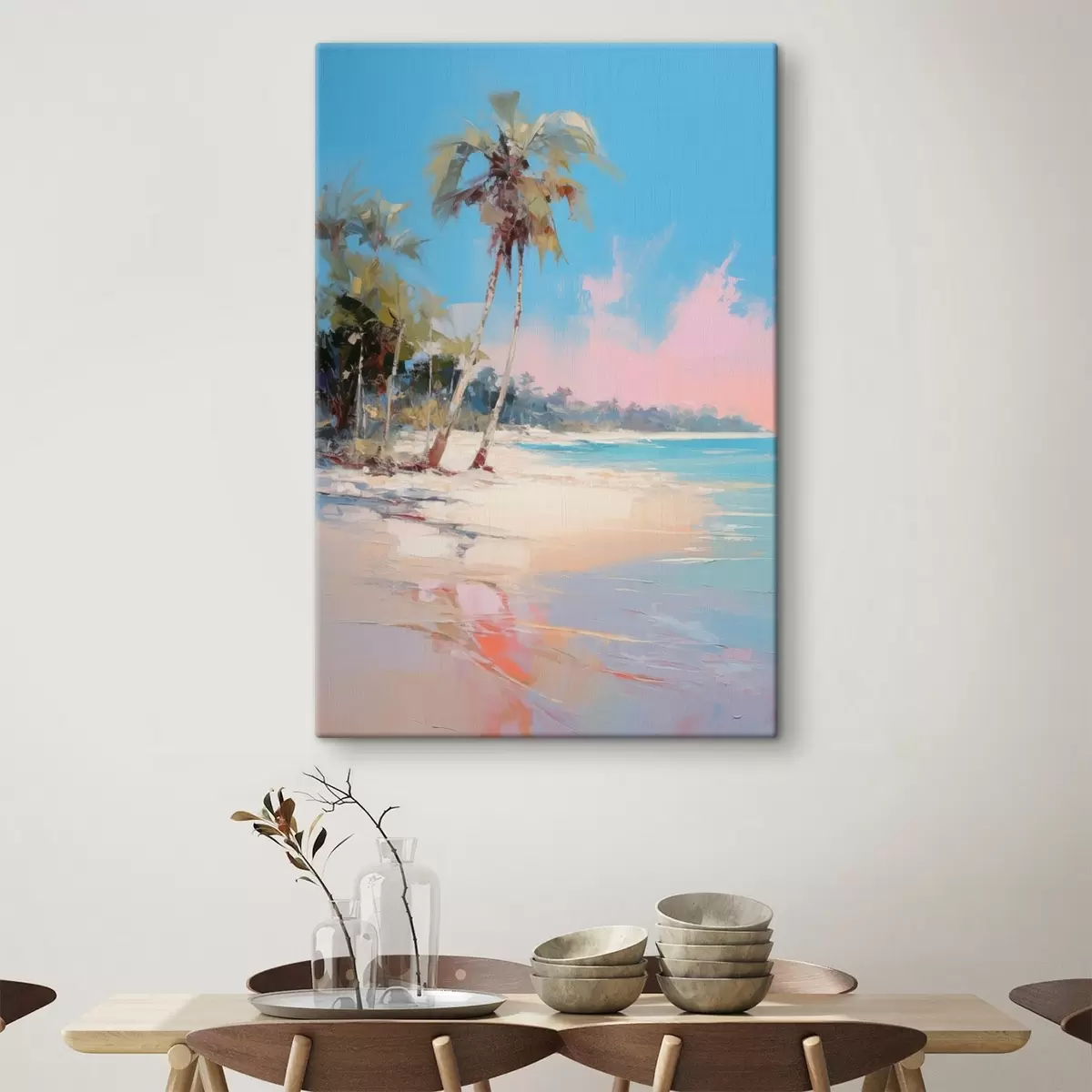 Quadri Spiaggia tropicale astratta con sabbia bianca e palme, cielo blu con nuvole bianche Nr s46285