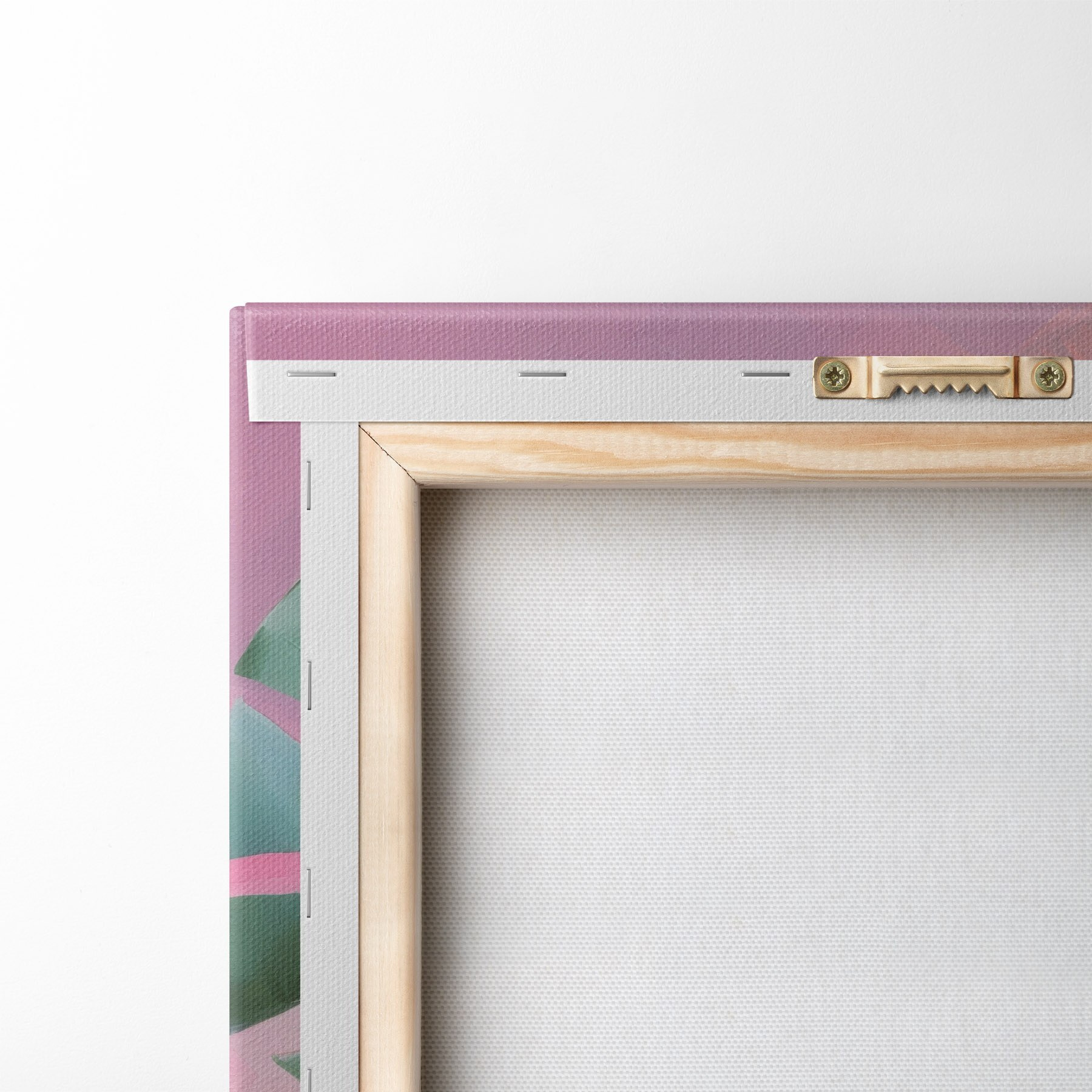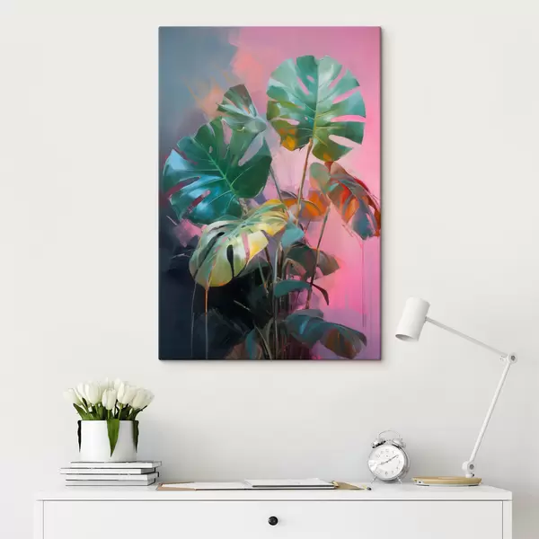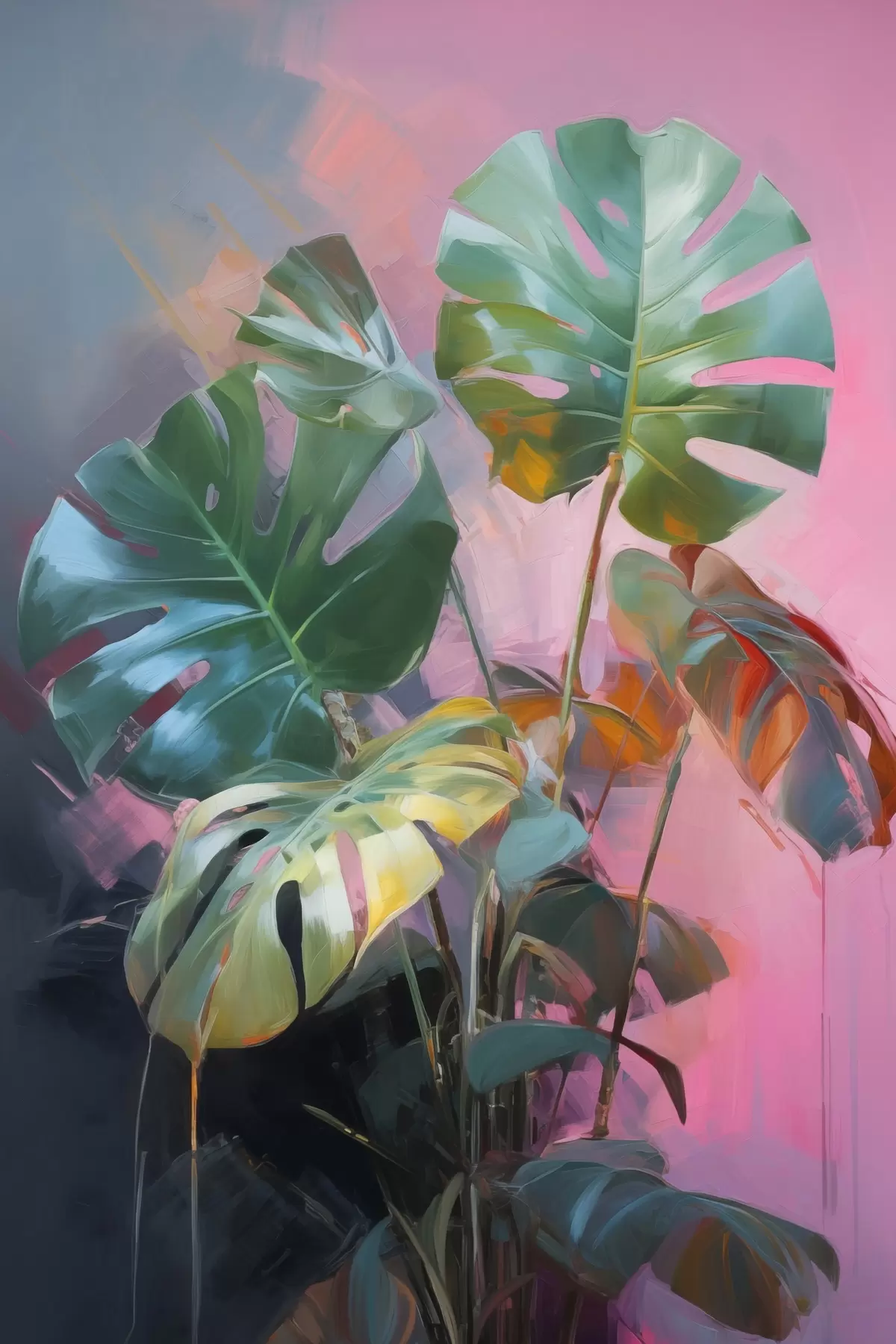 Quadri Pianta astratta di monstera con foglie verde brillante, su uno sfondo di delicate tonalità rosa e viola Nr s46286