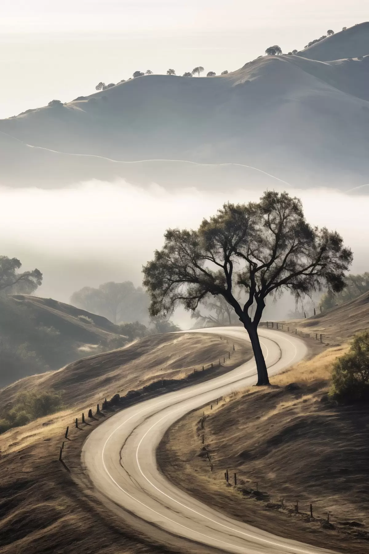 carta da parati Una strada tortuosa che attraversa dolci colline con un albero in primo piano, sullo sfondo nebbia e montagne nr. s46288