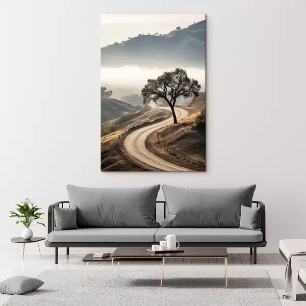 Quadri Una strada tortuosa che attraversa dolci colline con un albero in primo piano, sullo sfondo nebbia e montagne Nr s46288