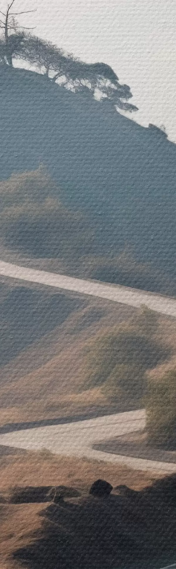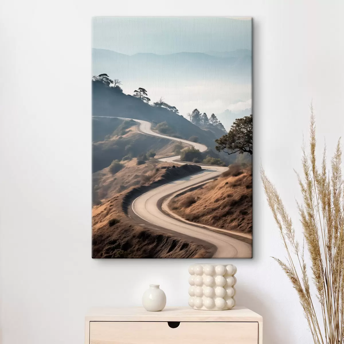 Quadri Una strada tortuosa che attraversa un paesaggio collinare con erba secca sotto un cielo limpido e montagne in lontananza Nr s46289