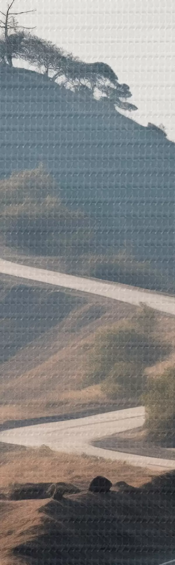 carta da parati Una strada tortuosa che attraversa un paesaggio collinare con erba secca sotto un cielo limpido e montagne in lontananza nr. s46289