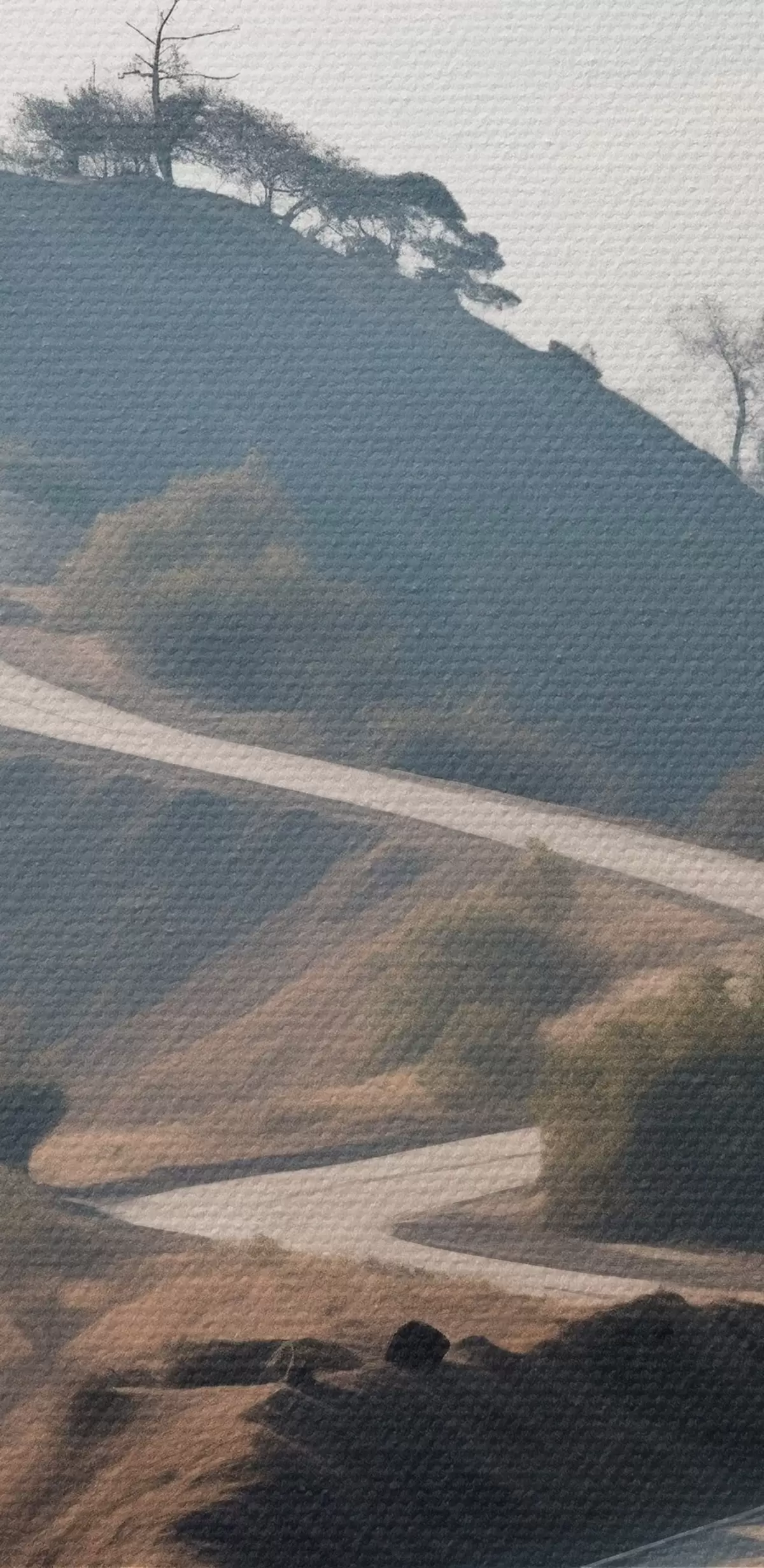 Quadri Una strada tortuosa che attraversa un paesaggio collinare con erba secca sotto un cielo limpido e montagne in lontananza Nr s46289