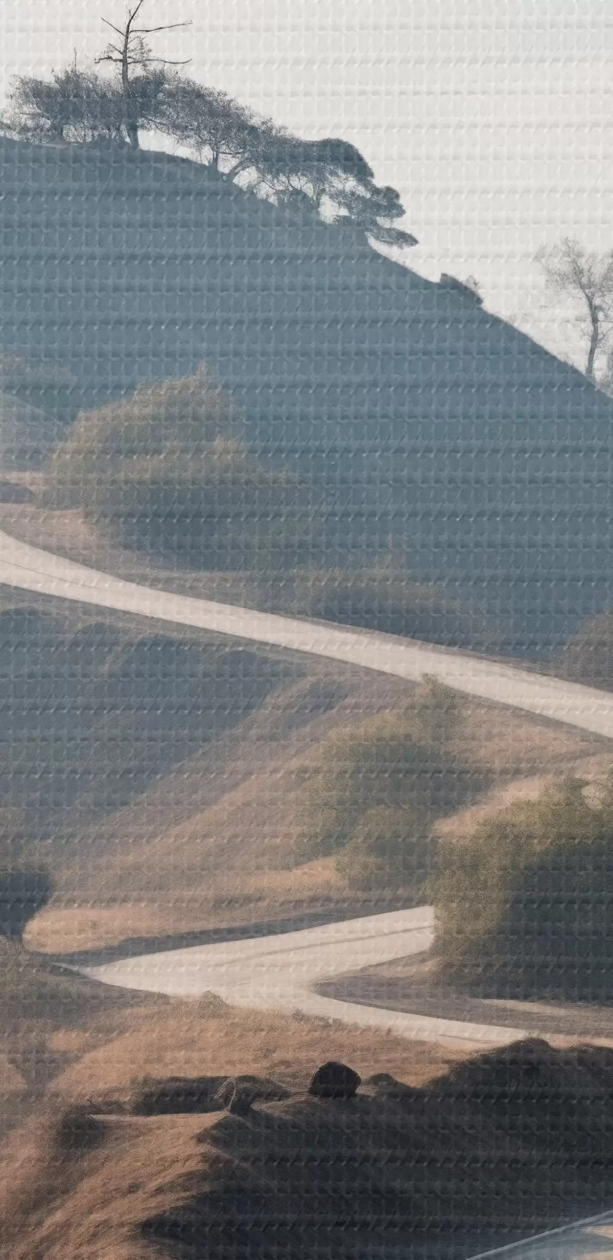 carta da parati Una strada tortuosa che attraversa un paesaggio collinare con erba secca sotto un cielo limpido e montagne in lontananza nr. s46289